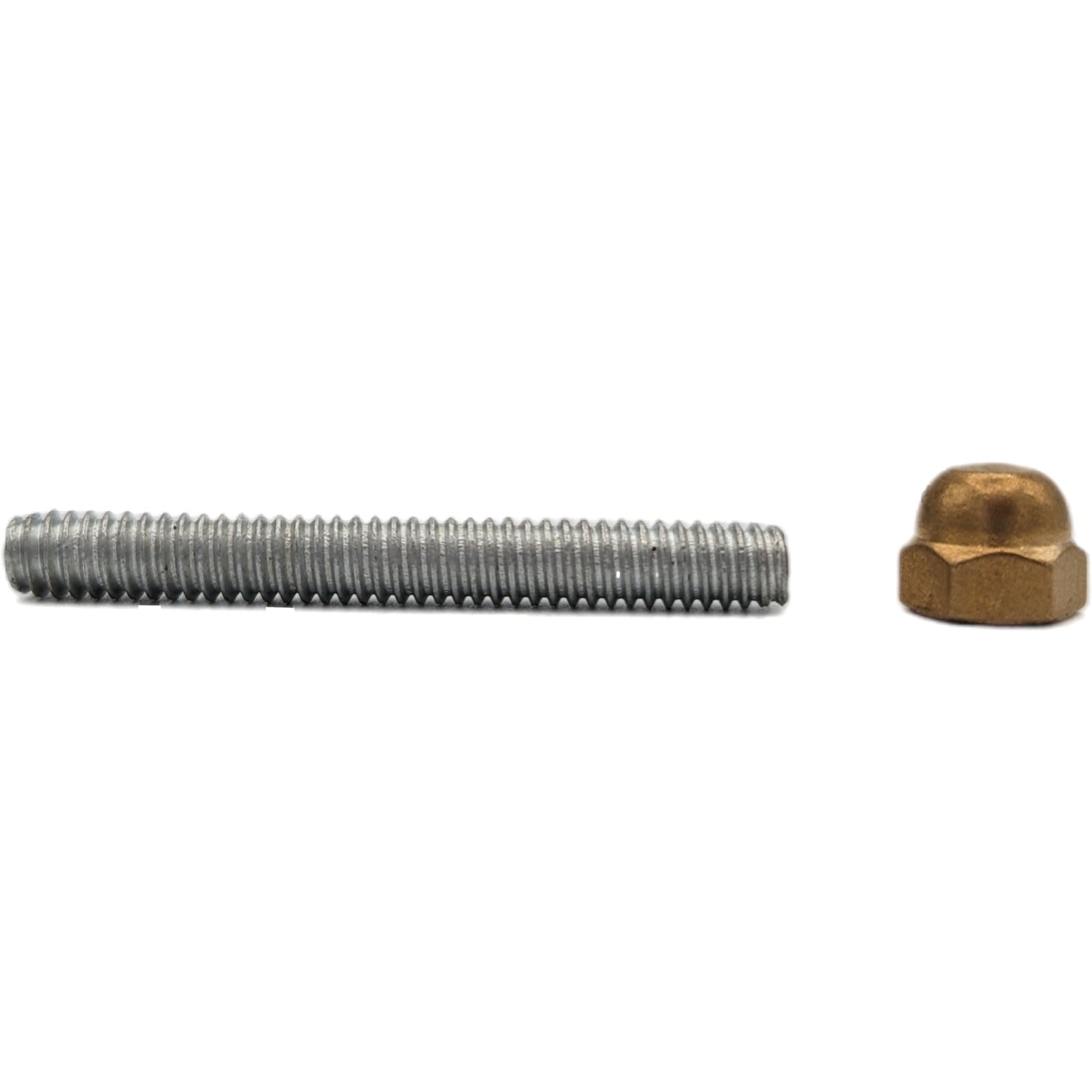 Our selection of 1/4"-20 Threaded Machine Screws come with a Acorn Nut that screws on. The length of the screw is approximately 2.15 inches. The width of the nut is approximately 0.5 inches. Finishes available for the Acorn Nut are Polished Chrome, Polished Brass, Antique Brass, and Black Bronze.