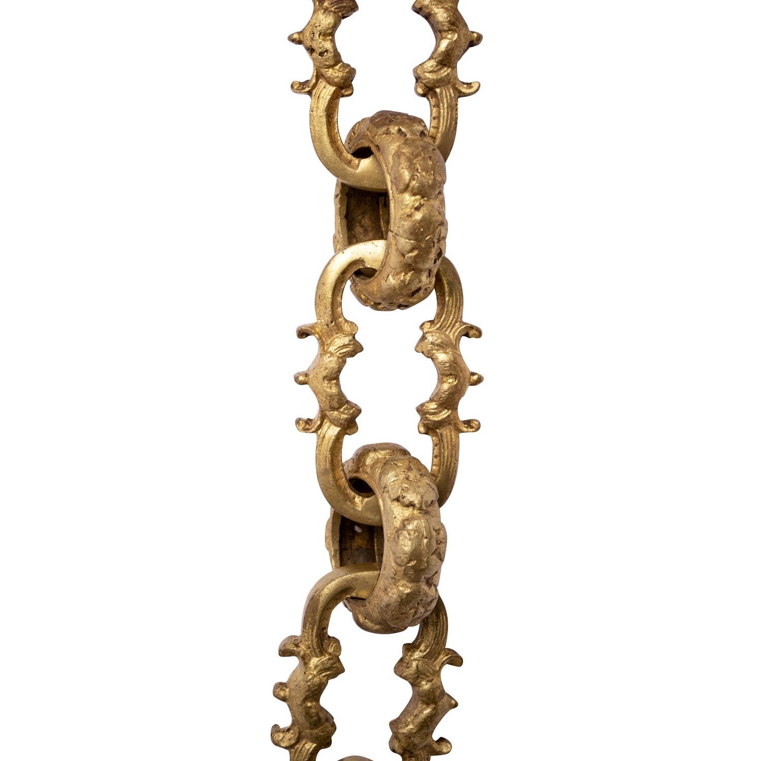 The solid brass chain pictured here is finished in brass. Each link is hand made and the antique design is hand cast. Each one foot section weighs approximately 0.7 pounds.