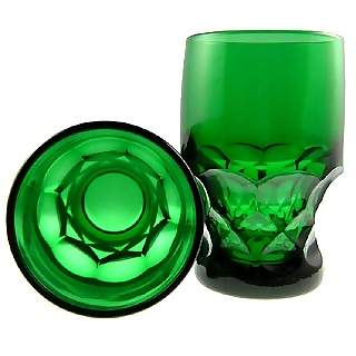 These glass tumblers are handmade in the United States for lookintheattic & company. The color is Emerald or Hunter Green. The glass pattern is called Georgia and these are the large 12 ounce tumblers in a set of four. The 12 ounce tumblers measures 5 1/4 inches tall.