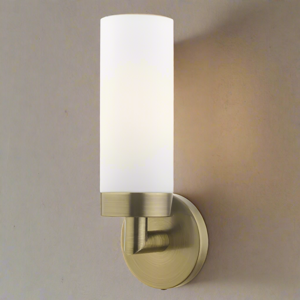 The 15071-01 Aero Wall Sconce is a captivating addition for those looking to enhance their space with a touch of elegance and modern flair. This ADA-compliant fixture features a striking antique brass finish that beautifully complements the hand-blown satin opal white glass shade. Measuring 4.25 inches in width and 11.75 inches in height, it extends 4 inches from the wall, making it ideal for a variety of locations. Designed for damp locations, this single-light sconce supports a medium base bulb with a maximum wattage of 60W, allowing you to personalize your lighting experience while adding a nautical, industrial, or contemporary touch to your decor.