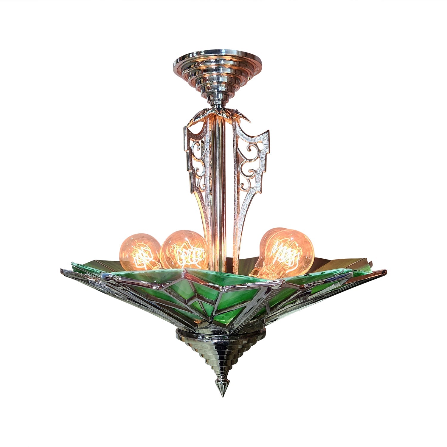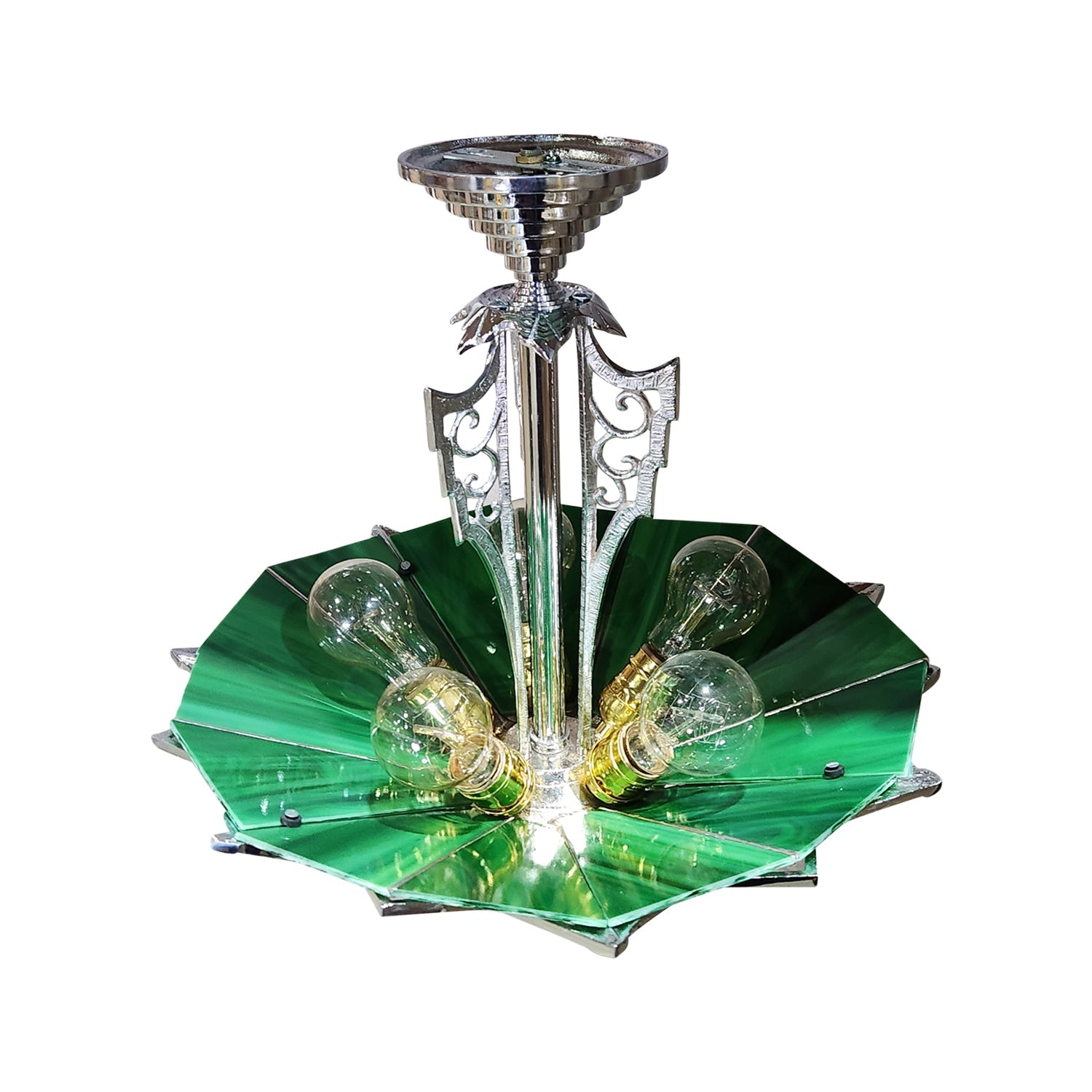 This item is hand crafted from solid brass using the Lost Wax casting method and this comes with stained glass panels that are made in Michigan. The chandelier's overall height measures 17 inches with a 16 1/2 inch diameter. This close ceiling light is made from solid brass construction and weighs approximately 12.5 pounds. This uses five bulbs (maximum of 50 Watts each) and this fixture comes complete with the mounting hardware.