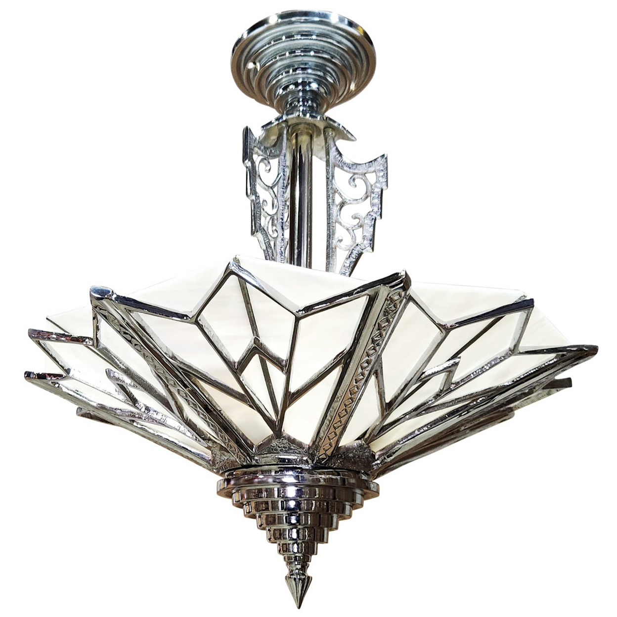 Illuminate your space with timeless elegance using the 17-inch Classic Art Deco Close Ceiling Light in a polished chrome finish. The exquisite white stained glass casts a soft and inviting glow, while the sleek lines and Art Deco design add a touch of sophistication to any room. Elevate your interior with this meticulously crafted ceiling light, where form and function harmonize to create a statement piece that transcends trends.