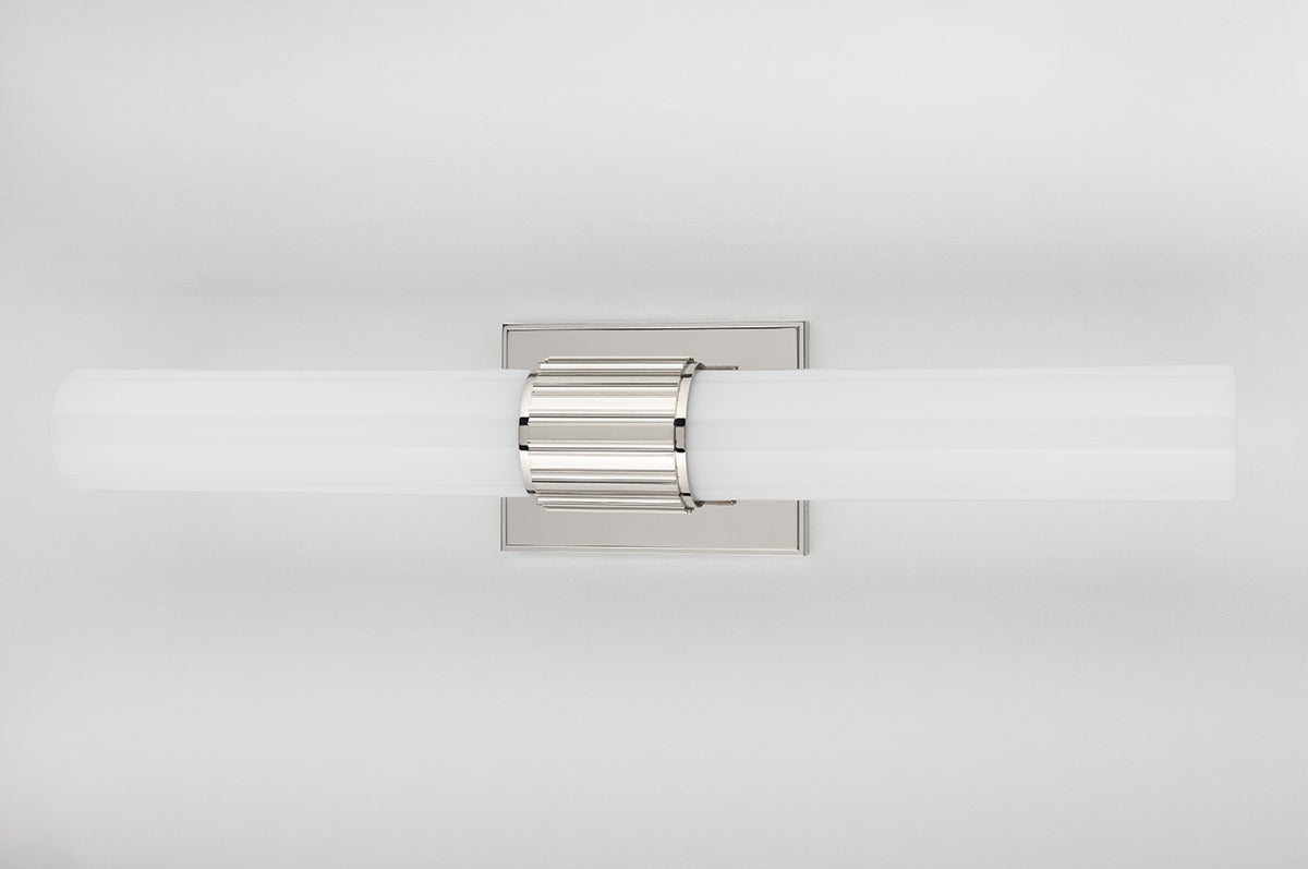 The Fulton Wall Sconce by Hudson Valley Lighting is a sophisticated fixture that combines modern design with functional elegance. Standing at 20.50 inches in height and featuring a width of 4.75 inches, this sconce has a sleek 4.00-inch extension. The opal matte glass shade enhances the ambiance while accommodating two E26 medium base bulbs with a maximum wattage of 75W each (bulbs not included). With a recommended bulb type of T10-5.5, this sconce is suitable for various settings. Available in finish options of Old Bronze, Polished Nickel, and Satin Nickel, the Fulton is UL Damp rated, making it a perfect choice for humid environments such as bathrooms.