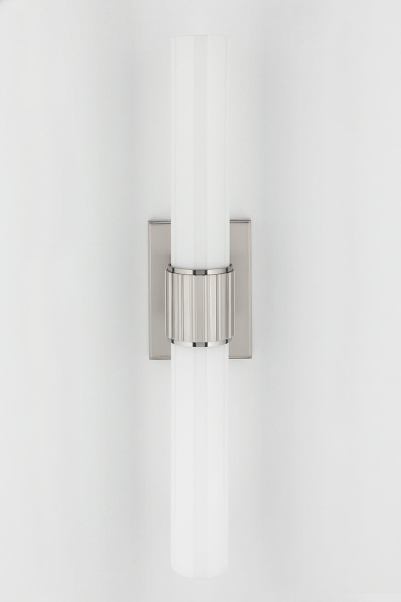 The Fulton Wall Sconce by Hudson Valley Lighting is an elegant addition to your decor, featuring a stylish opal matte glass shade that beautifully diffuses light. This sconce measures 4.75 inches in width and 20.50 inches in height, with a 4-inch extension. Designed for two E26 medium base bulbs with a maximum wattage of 75W each (not included), it is perfect for adding brightness to any room. The fixture is available in three elegant finishes: Old Bronze, Polished Nickel, and Satin Nickel, and is UL Damp rated, making it suitable for use in humid environments.