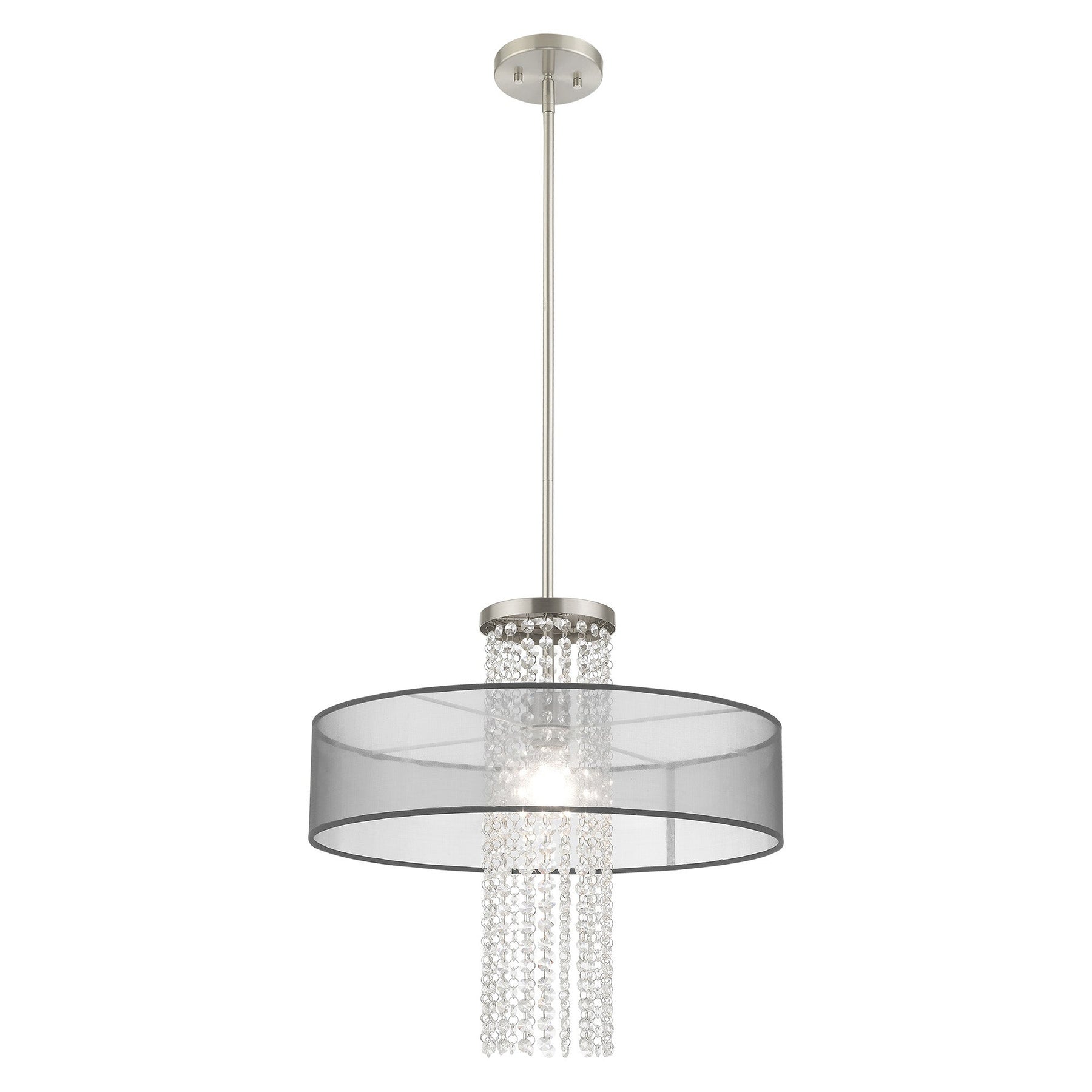 The Bella Vista Pendant Chandelier (Item number: 43204-91) is a stunning addition for those desiring a blend of modern elegance and traditional design. This fixture features a handcrafted translucent black fabric shade adorned with clear crystals, suspended from a brushed nickel finish. With an adjustable height ranging from 27.5 to 57.5 inches and a diameter of 20 inches, it accommodates various ceiling heights while delivering a glamorous lighting effect. The chandelier requires one medium base bulb with a maximum wattage of 100W (bulb not included) and comes with 8 feet of wire. It is suitable for damp locations, enhancing its versatility for various settings. The chandelier also accommodates sloped ceilings and includes additional stem sections of 6