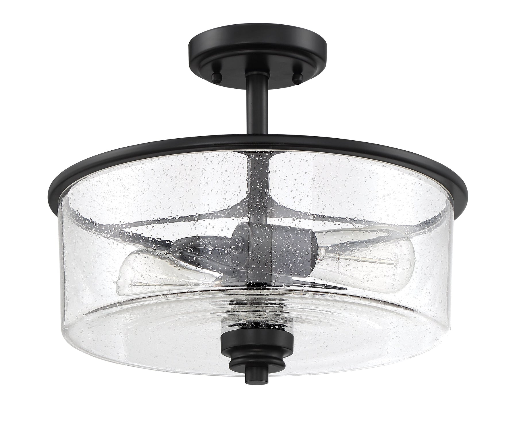 The Bolden 2 Light Convertible Semi Flush in Flat Black combines bold clean lines with the elegance of clear seeded or white frosted glass shades, creating a luxurious and effortless look. This indoor-rated fixture requires two medium base 60-watt bulbs (not included) and measures 13 inches in width, 13 inches in depth, and 15 inches in height. With a leadwire length of 120 inches and a canopy size of 4.75 by 4.75 inches, this convertible semi flush mount light is designed for versatility and style.