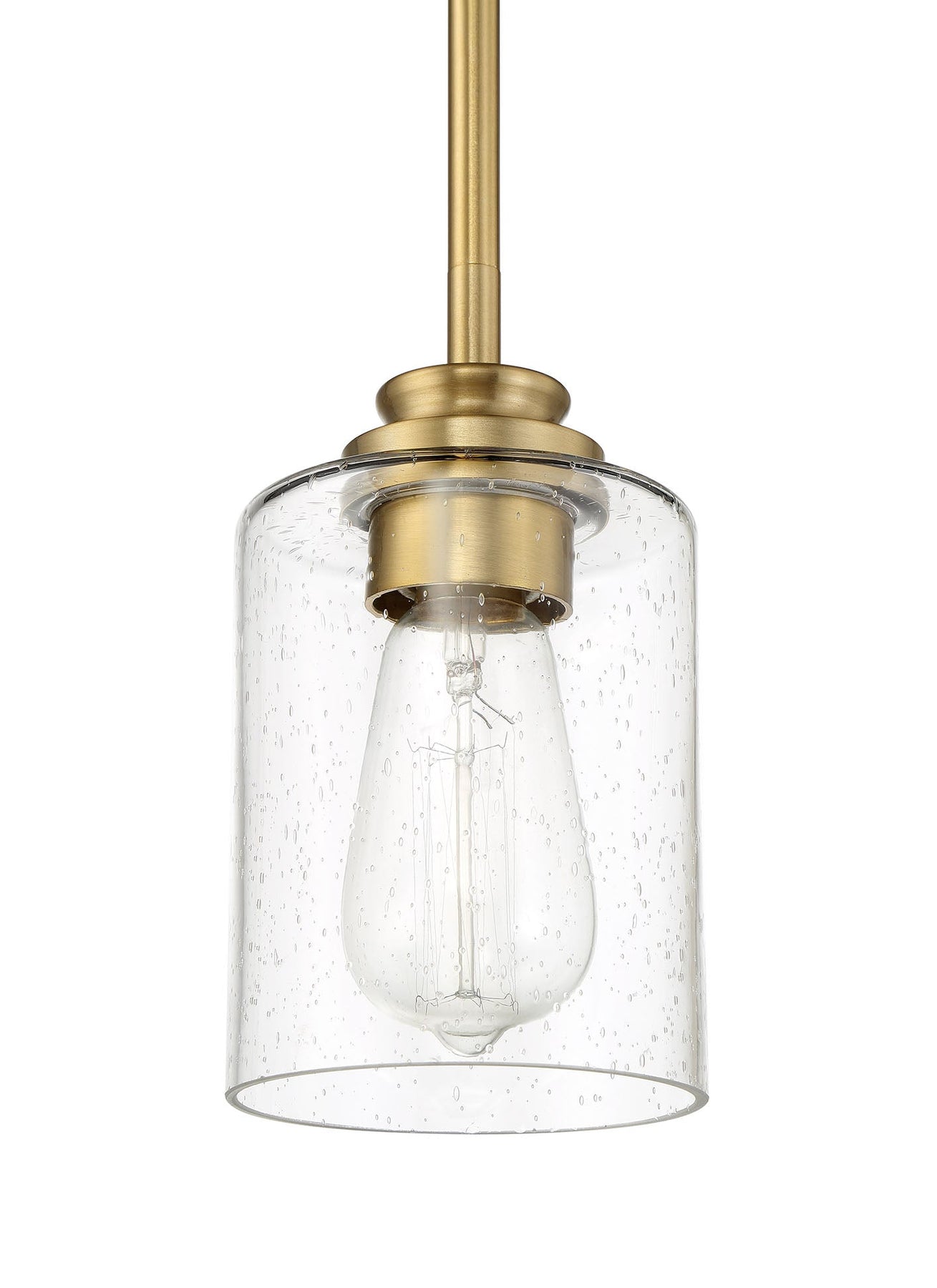 The Bolden - 50591-SB 1 Light Mini Pendant in Satin Brass showcases sleek, bold lines complemented by a choice of clear seeded or white frosted glass shades, creating a luxurious yet effortless look. This indoor-rated pendant requires one E26 medium base bulb with a maximum wattage of 60W (not included). It features three 12-inch downrods and one 6-inch downrod for adjustable height options. The pendant measures 5 inches in width and depth, with a height of 7.25 inches, making it suitable for a variety of spaces.