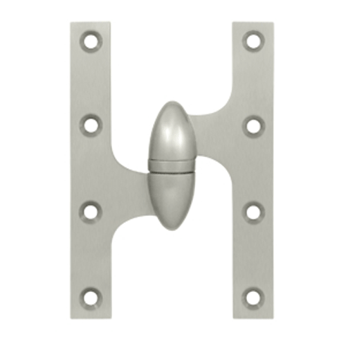 6 Inch x 4 Inch Solid Brass Olive Knuckle Hinge (Brushed Nickel Finish) - This hinge measures 6 inches tall by 4 inches wide and is left-handed. The hinge comes complete with the mounting hardware.