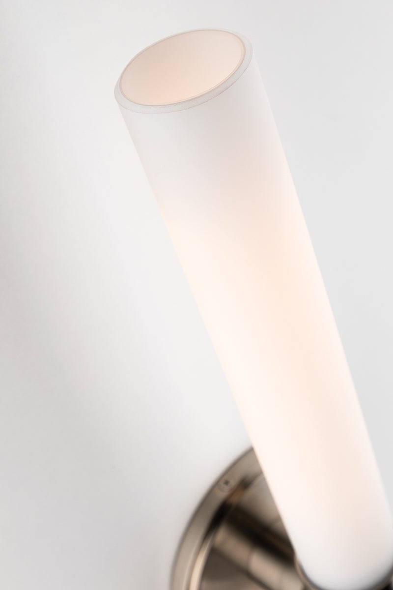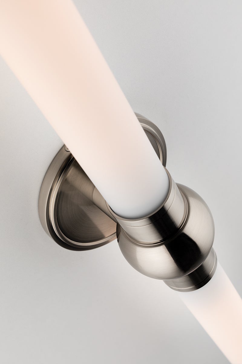 The Cornwall Wall Sconce by Hudson Valley Lighting features a sleek and sophisticated design, perfect for enhancing your living space. Measuring 5.00 inches in width and 25.50 inches in height, with an extension of 4.50 inches, this sconce is equipped to accommodate two E26 medium base bulbs, each with a maximum wattage of 75W (bulbs not included). The stunning opal matte glass shade casts a soft, inviting glow, while the fixture offers a variety of finish options including Aged Brass, Polished Chrome, Polished Nickel, and Satin Nickel. With a UL Damp rating, it is suitable for use in bathrooms and other humid environments.