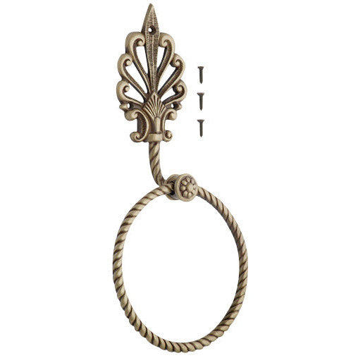 Fleur De Lis Towel Ring (Antique Brass Finish). Fleur De Lis part measures 4 1/2 inch tall and 3 inch wide with a projection of 1 3/4 inch. The ring measures 5 inch in diameter. Comes complete with mounting hardware. Available in several different finishes including antique brass, polished brass, and Black Bronze.
