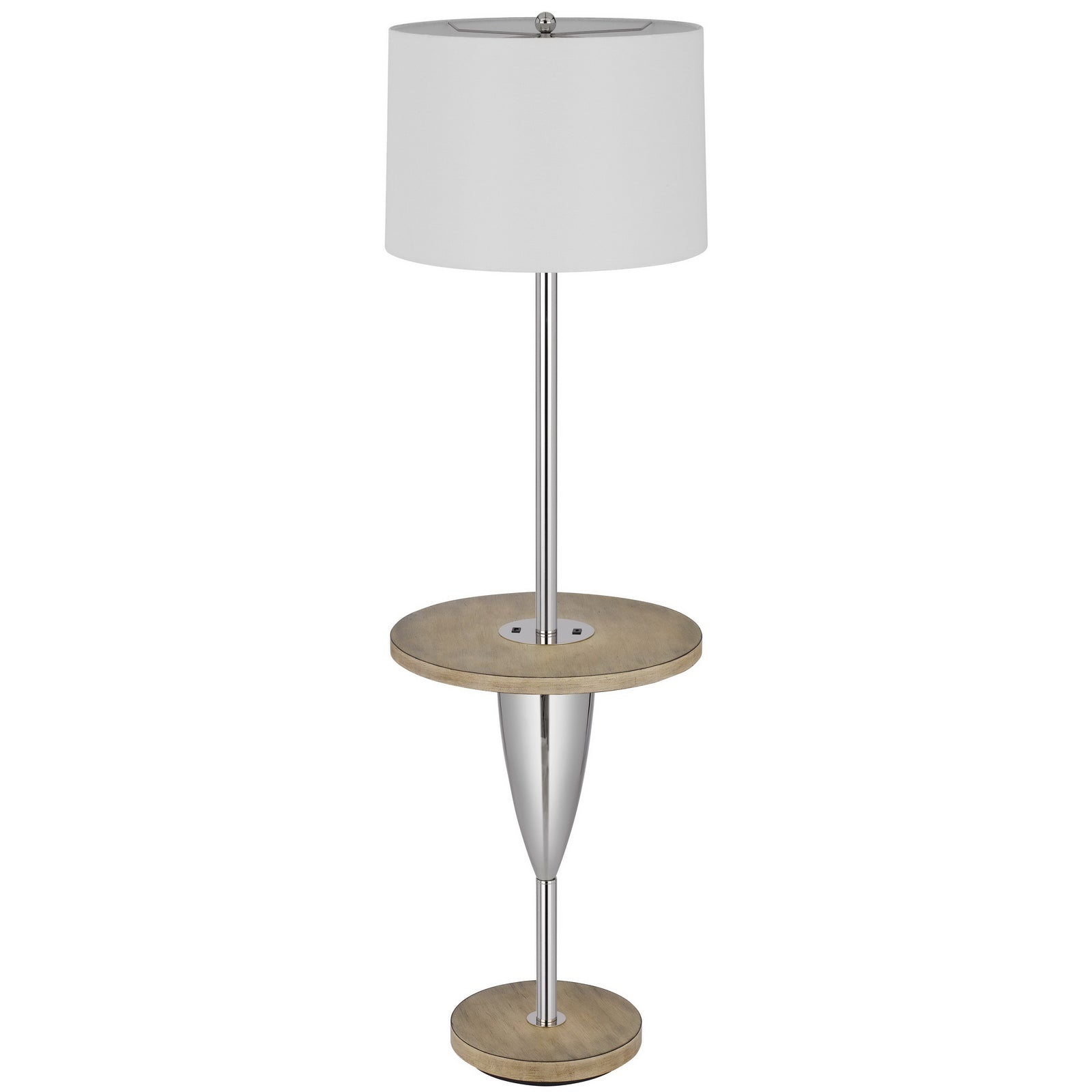 The BO-3054TFL 150W 3-Way Lockport Metal Floor Lamp is a perfect blend of style and functionality for any room. Featuring a durable metal construction with a high gloss chrome finish and elegant wooden accents, this lamp is designed to enhance your space. It comes equipped with a circular wooden tray table at the center, offering convenience alongside a functional USB port and a Type C USB charging port for your devices. With its weighted base for stability and a chic hardback fabric shade included, this lamp not only illuminates but also beautifies your area. It requires one E26 bulb (not included) and measures 20.30 inches in length, 20.30 inches in width, and 18.00 inches in height, ensuring it fits seamlessly into your decor.