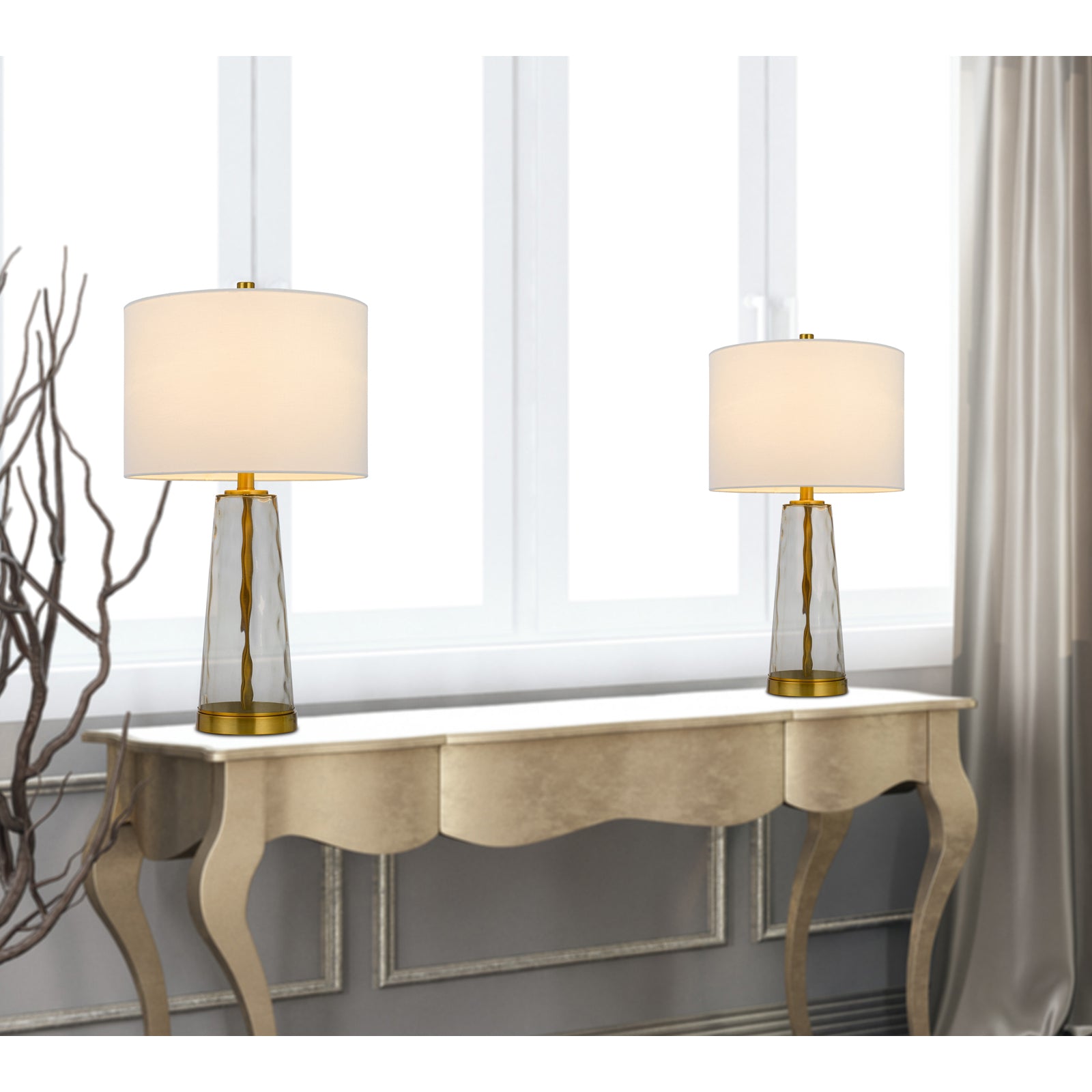 The BO-3059TB-2 100W Heber glass table lamp is a stunning addition to any room, sold as a pair for added value. This lamp boasts a durable metal and glass construction with a light smoke ripped glass body, exuding a touch of glam. Each lamp is topped with a hardback linen shade for a polished finish. With little to no assembly required and packaged in a single carton, it is designed for convenience. It operates with a standard E26 bulb base and features an ON/OFF switch, making it practical for daily use. Measuring 14 inches in length and width, and 26 inches in height, this elegant lamp set is perfect for enhancing your decor.