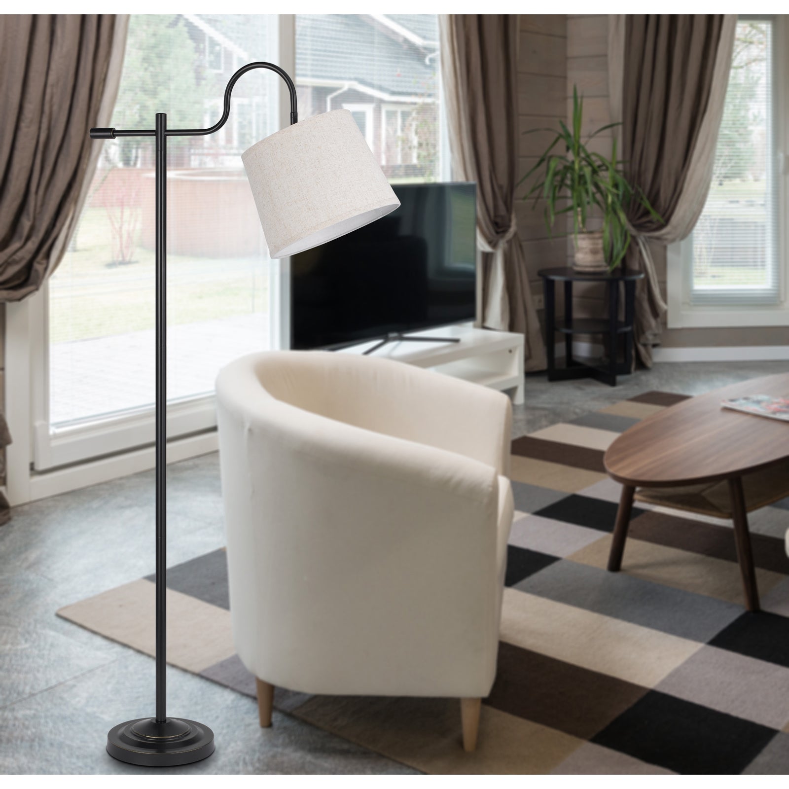 The 60W Rexburg metal downbridge floor lamp is an ideal lighting solution that combines durability with style. Crafted from sturdy metal, it features a hardback fabric shade that softens the light, providing a warm ambiance. The adjustable shade allows for customizable lighting angles, while the weighted base ensures stability. With little to no assembly required, this lamp is convenient to set up and measures 20.00 inches in length, 14.50 inches in width, and 15.00 inches in height. It is designed to accommodate one E26 bulb with a maximum wattage of 60W, making it perfect for illuminating various spaces in your home.