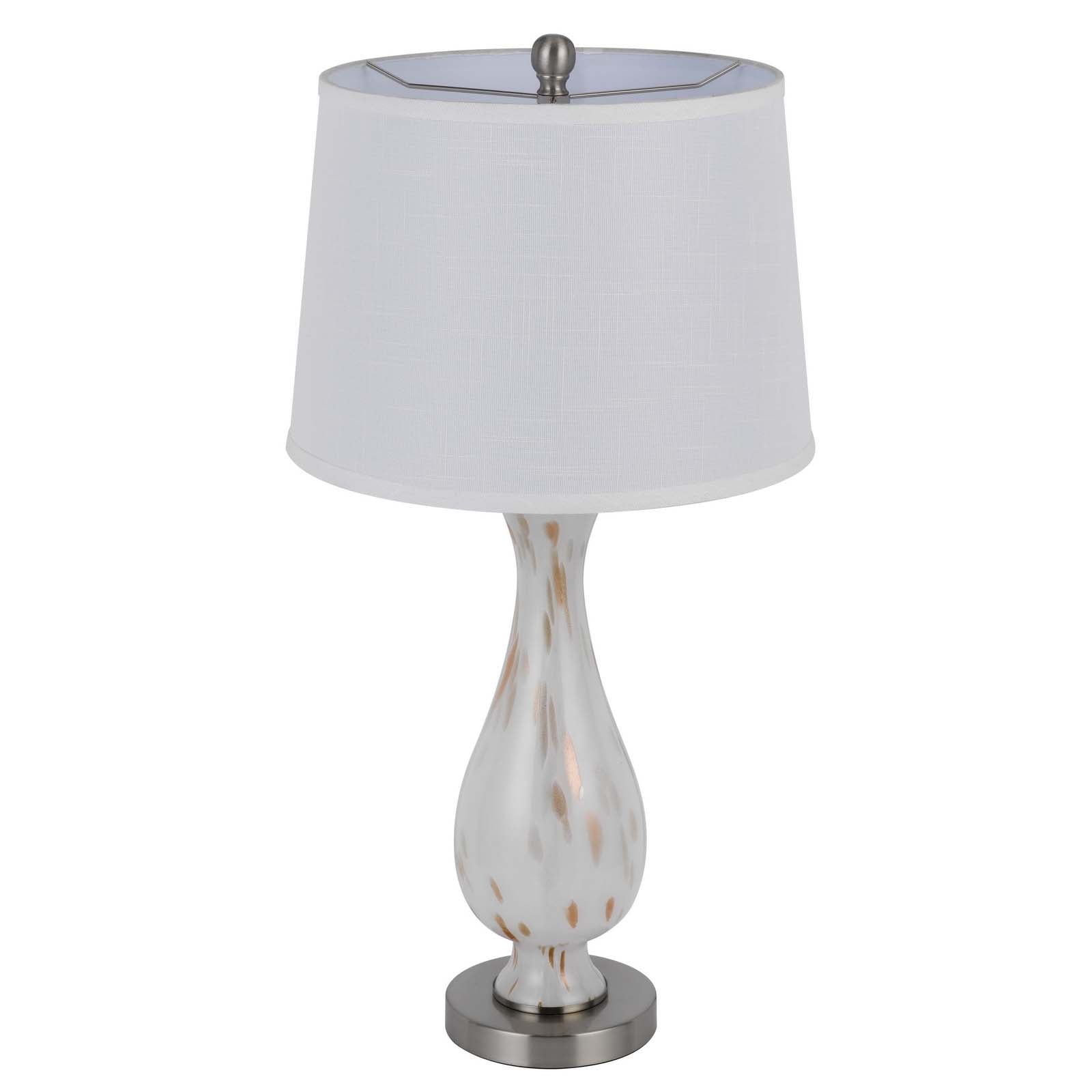 The BO-3172TB-2 Abinger glass table lamp set offers an elegant lighting solution with a touch of artistry. Featuring a frosted white glass base adorned with metallic copper streaks, this durable lamp stands out with its unique design. Equipped with a convenient three-way rotary switch, this lamp supports a maximum wattage of 150W across two lights (bulbs not included), and includes matching round hardback fabric shades. Each lamp measures 15.80 inches in width and 20.30 inches in height, making it suitable for various room settings. This pair ships complete in one carton and comes with a one-year warranty, ensuring quality and satisfaction.