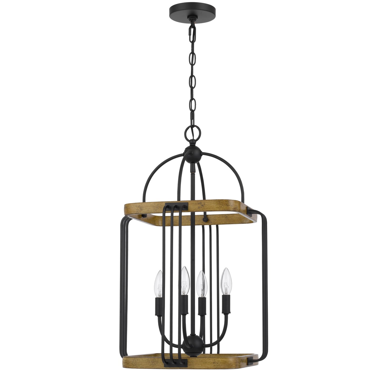 The Ripon Metal Chandelier, Product No. FX-3772-4, features a striking wood finish combined with durable iron construction. This stylish chandelier includes four upturned lights with a total wattage of 240W, compatible with E12 bulbs (not included). It comes with six feet of chain for adjustable hanging and a matching canopy, making it easy to install. With its cage-inspired design and smooth matte dark finish, this chandelier makes a bold statement in any space. The chandelier requires minor assembly and ships in one carton. Backed by a one-year warranty, it promises to be free from defects in material and workmanship.