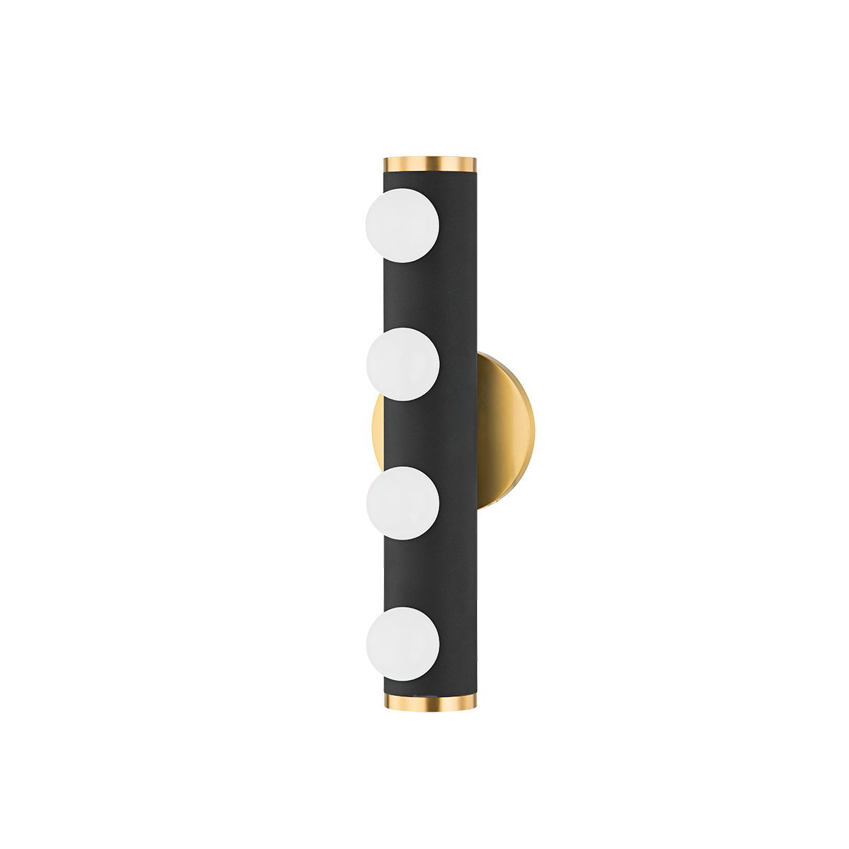 The Penny Wall Sconce by Mitzi is a captivating lighting fixture that adds elegance to any space. Featuring a striking Aged Brass finish with texture options in Aged Brass or Aged Brass/Textured Black combo, this sconce measures 4.75 inches in width and 15 inches in height, with a 4.25-inch extension. It accommodates four E12 candelabra base bulbs (not included), each with a maximum wattage of 40W, perfect for creating a warm and inviting atmosphere. Designed for versatility, the sconce is UL Damp rated, making it suitable for areas prone to moisture.