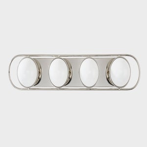 The Amy 4-Light Wall Sconce in Aged Brass or Polished Nickel is a stunning addition to any modern space, offering a stylish and functional lighting solution. Measuring 29.75 inches in diameter and 5.50 inches in height, this fixture features a 5.25-inch extension and a 2.75-inch top-to-center measurement. It is designed to accommodate four G9 LED bulbs (not included), with a maximum wattage of 6W per lamp. The elegant glass shade enhances its aesthetic, while the ETL Damp rating makes it suitable for both indoor and covered outdoor environments.