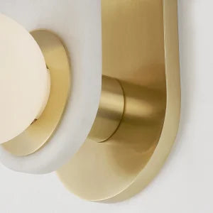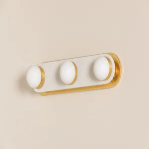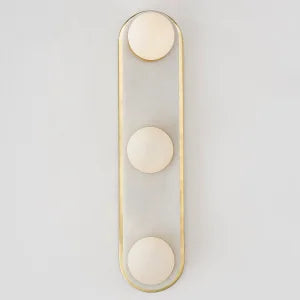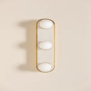 Glass globes are backed in Aged Brass then displayed on a piece of Soft Thassos white marble and mounted to a similarly shaped piece of Aged Brass creating a gorgeous layering effect. The marble has very little veining or variation, and the streamlined racetrack silhouette gives the design a jewelry-like quality. The three-light sconce can be mounted horizontally or vertically making it ideal for the bath or powder room.
