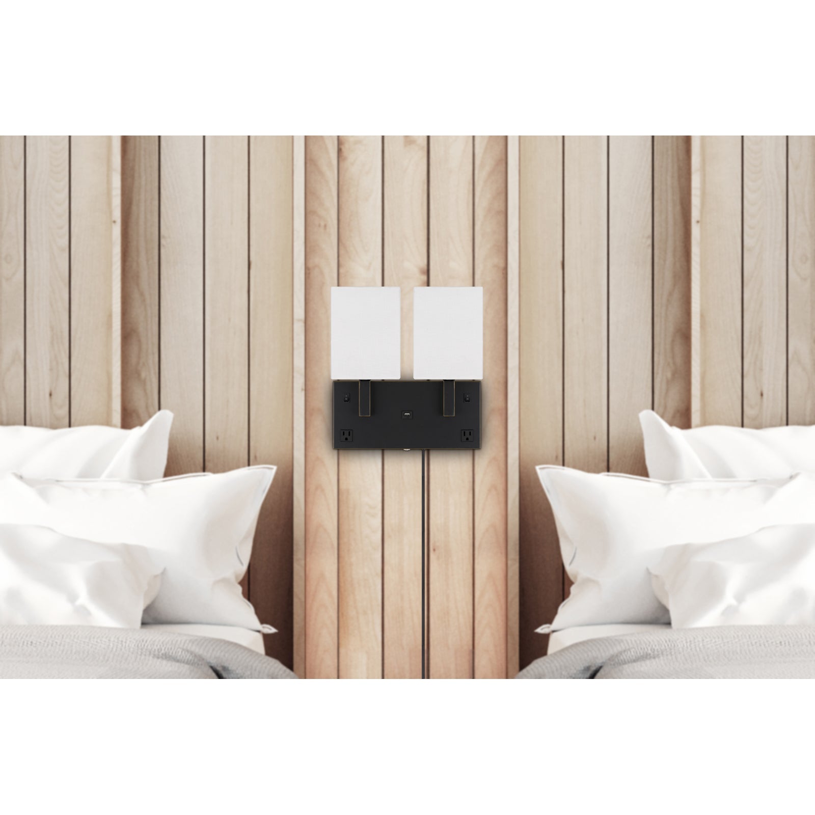 The LA-8048W2L-1 Oberlin Wall Lamp is a modern and functional addition to any space, featuring a durable metal construction and a stylish hardback fabric shade panel. This lamp utilizes two 40W bulbs (E12 base, not included) and includes two power outlets and one USB charging port on the base for added convenience. It measures compactly for versatile placement and is equipped with a rocker switch for easy operation. Assembly is required, and it comes with a one-year warranty, ensuring quality and reliability.