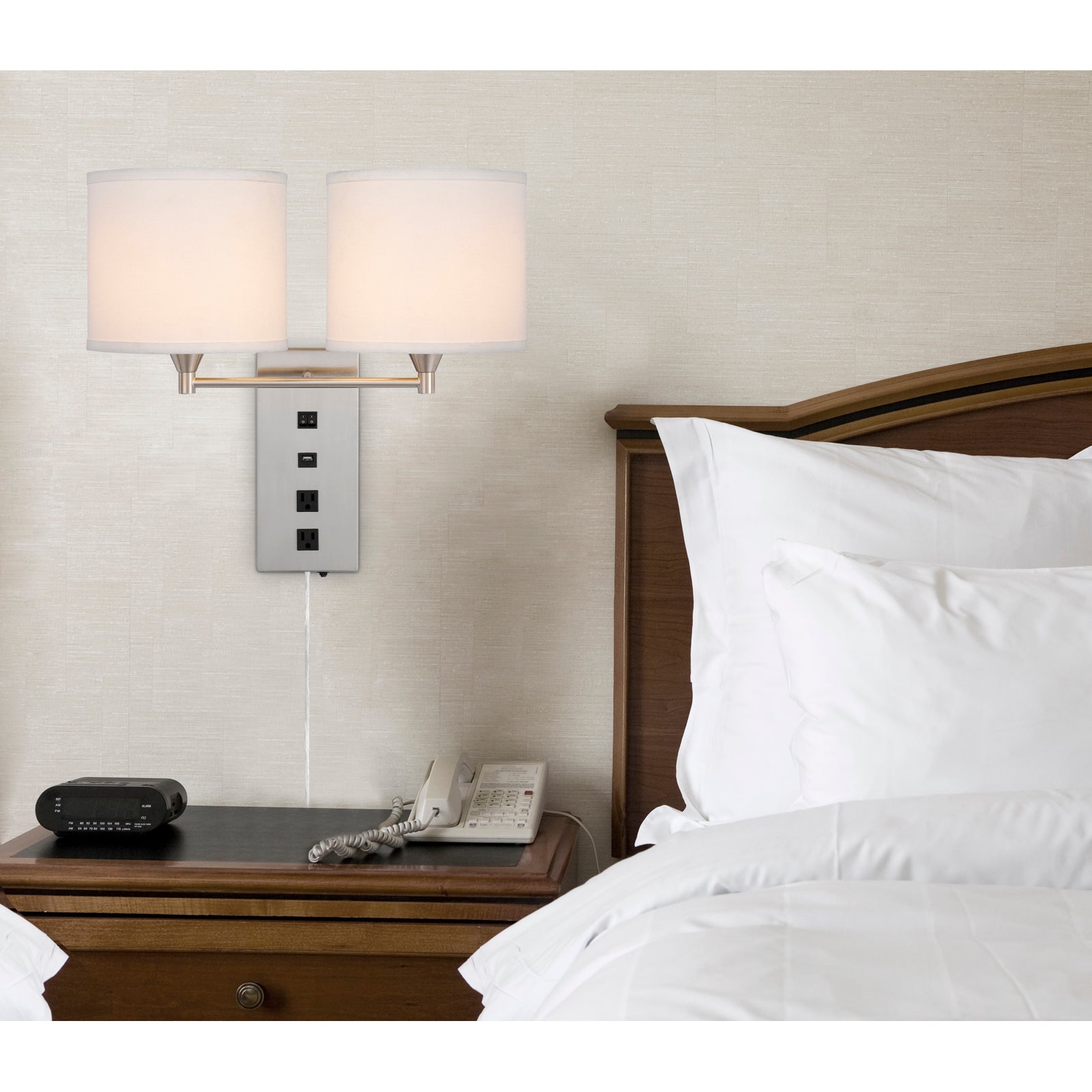 The Reedsport Wall Lamp (Product No. LA-8049W2L-1) is a modern and functional lighting solution that enhances any room's decor. This lamp features a durable metal construction and includes two 60W light fixtures, ensuring ample brightness. It is equipped with two power outlets and one USB charging port on the base for added convenience. The rocker switch allows for easy operation, while the round hardback fabric shade softens the light for a cozy ambiance. With a package dimension of 5.90 L x 22.00 W x 16.00 H, this stylish lamp is perfect for various settings and is both practical and elegant.