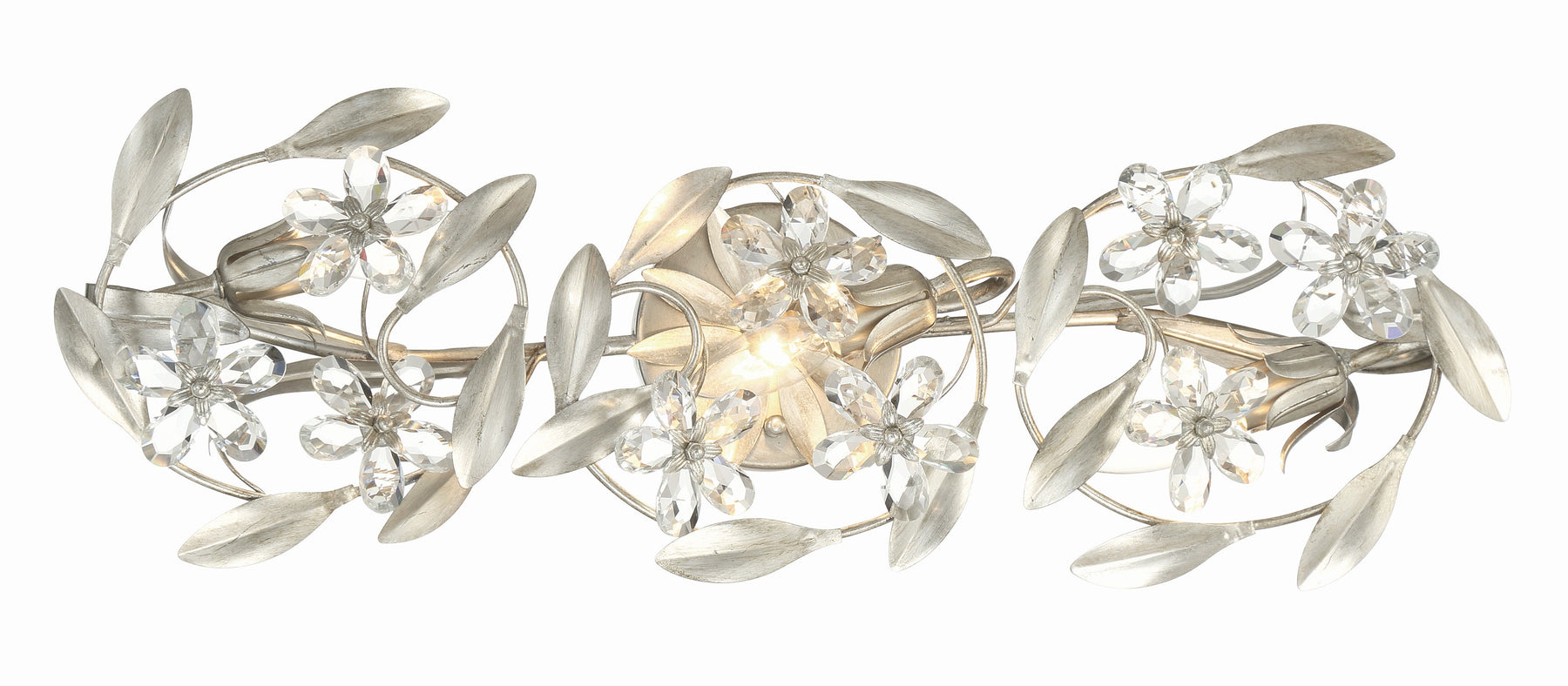 The Marselle Collection is adorned with hand-cut crystal jewels and wrought iron leaves designed in a playful arrangement. The detail of leaves and intricate floral designs lend a sense of organic artistry to each piece, creating a mesmerizing display of nature's splendor. Available in three sophisticated finishes—white, gold and silver, this collection offers a touch of opulence for every decor. The crystal jewels are cleverly connected to form delicate flowers, adding a touch of whimsy and charm to your space. Even the canopy features a leafy design, completing the harmonious blend of nature and art.