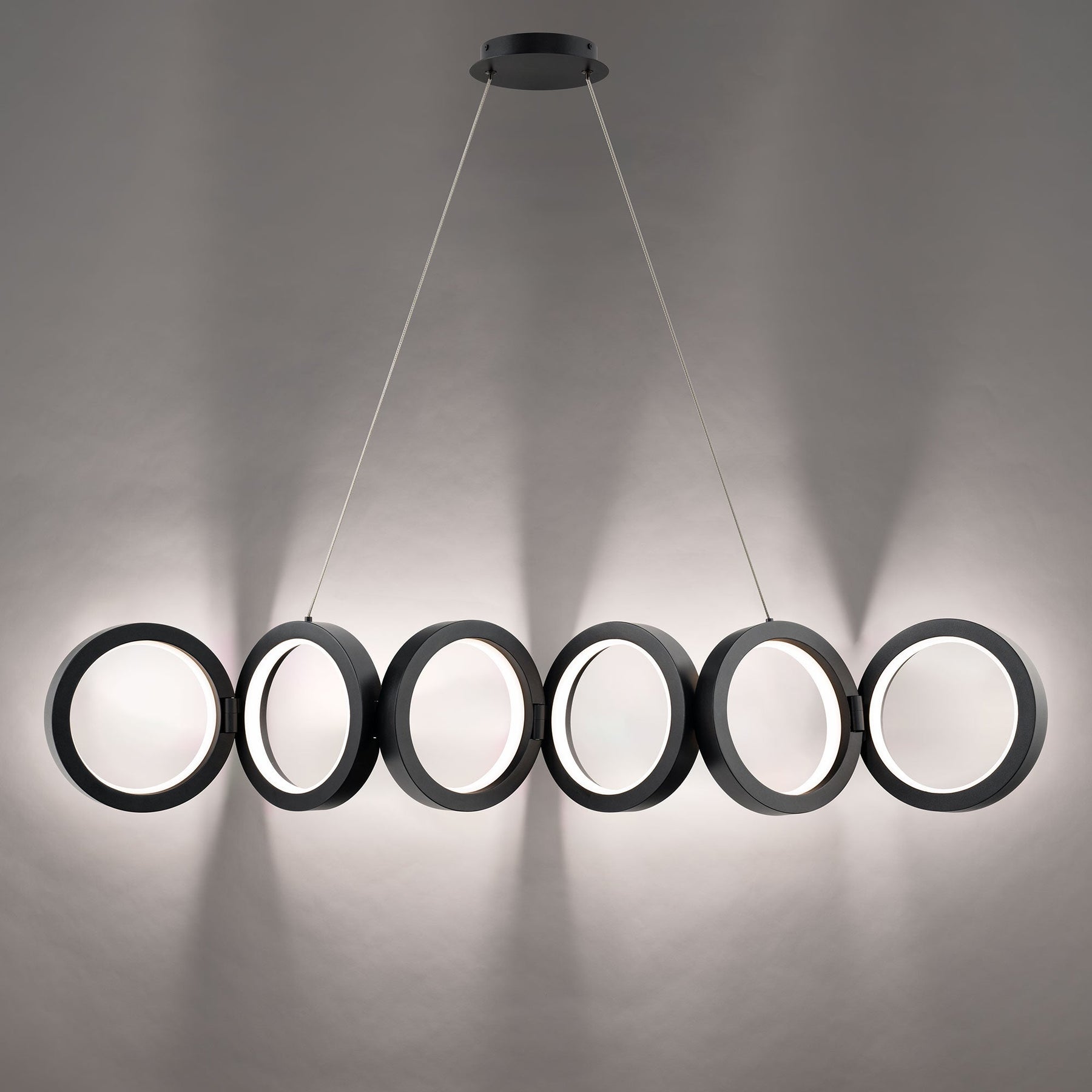 Cabot 48in LED Linear Pendant 3000K in Black. In the round. Rings of light glow softly through flush opal diffusers. Perfectly tethered to each other, this foldable design can be adjusted as desired along its linear length. Featuring an extruded aluminum body, with acrylic diffusers and adjustable rings Ultra-sleek electrified cable eliminates the need for clunky power wires. Height is simple to adjust through push pin connectors on the canopy. Sloped ceiling compatible. Driver is located in the canopy and installs within a junction box. Smooth and continuous dimming with an electronic low voltage (ELV) or TRIAC dimmer. High Powered Replaceable LED Module CRI: 90, Rated Hours: 50,000, Selectable Color Temp: 2700K-3000K-3500K-4000K Standards: ETL & cETL UL 1598 listed for Damp Locations.