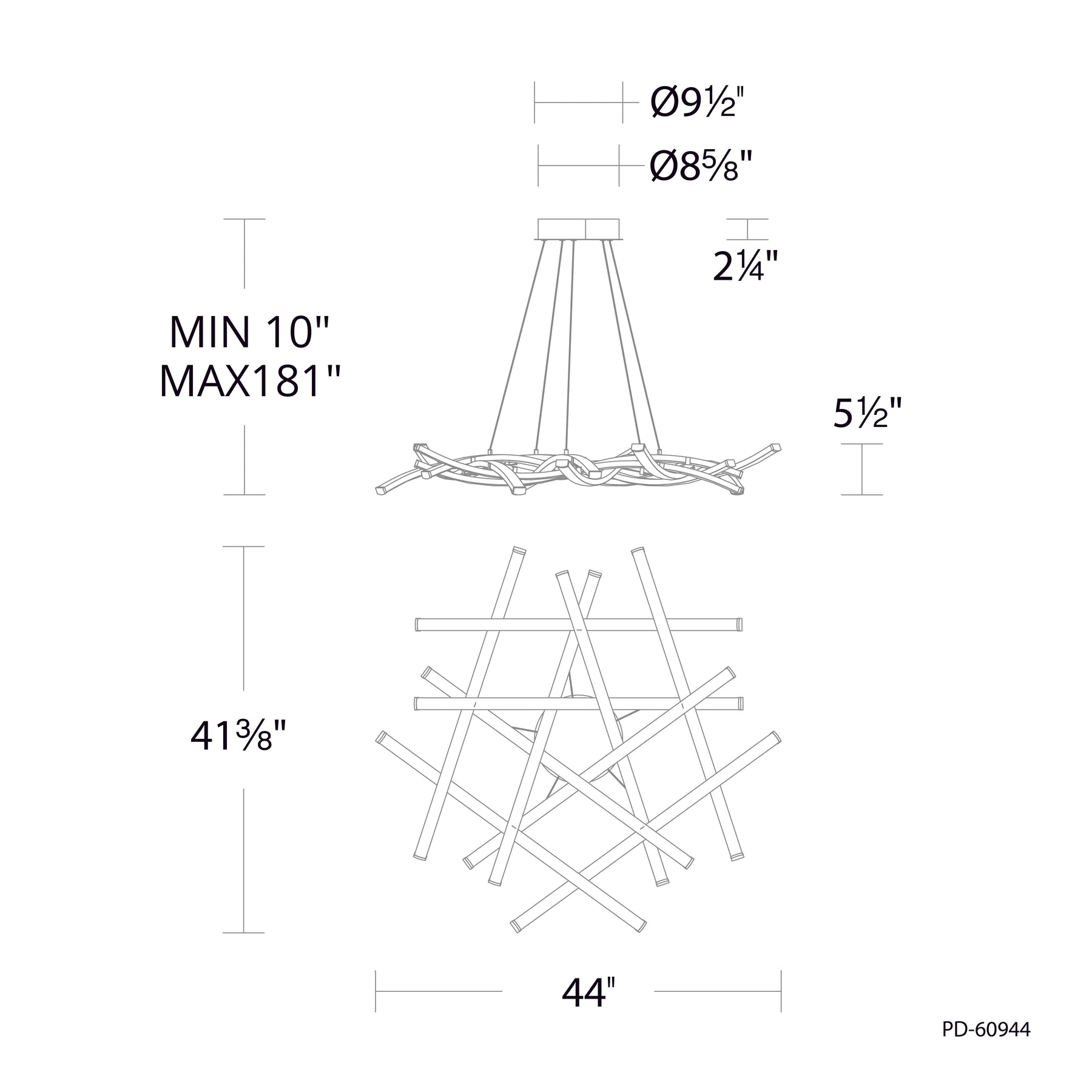 Divergence 44in LED Chandelier 3000K in Black. Flowing bands of light converge in this unique and striking pendant. Energy efficient integrated LED's provide a long-lasting maintenance-free bright and even illumination. Ultra-sleek electrified cable eliminates the need for clunky power wires. Height is simple to adjust through push pin connectors on the canopy. Aluminum extruded body with composite diffuser. Can be mounted on a slope ceiling. Ultra-sleek electrified cable eliminates the need for clunky power wires. Height is simple to adjust through push pin connectors on the canopy. Driver concealed within the canopy. Custom CCT options available by special order. Smooth and continuous dimming with an electronic low voltage (ELV) dimmer. High Powered Replaceable LED Module CRI: 90, Rated Hours: 50,000, Color Temp: 3000K Standards: ETL & cETL UL 1598 listed for Damp Locations. CEC Title 24 Compliant.