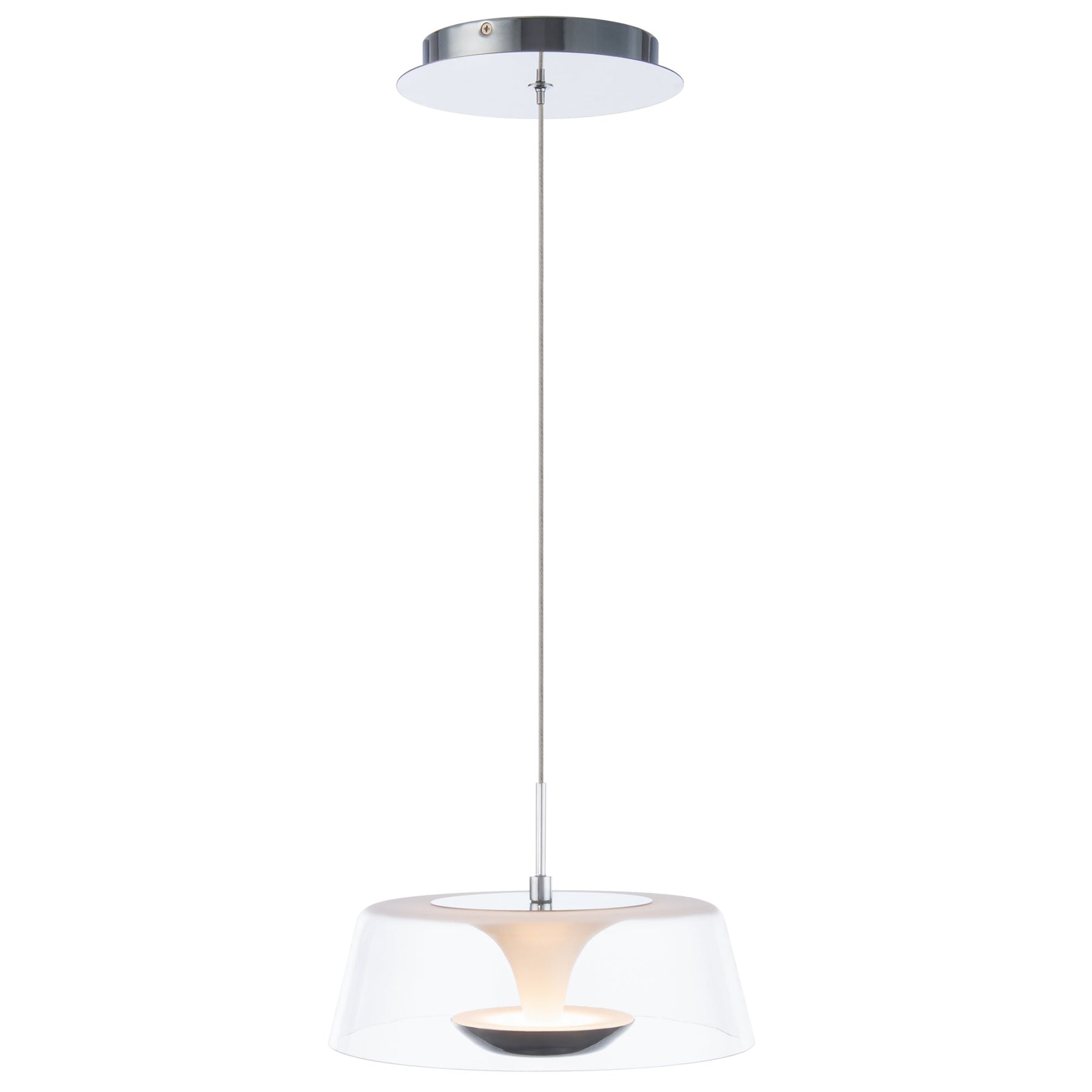 Branwen 9in LED Mini Pendant 3000K in Chrome. An ethereal element designed to complement modern interiors… Branwen is an LED mini pendant from dweLED by WAC. This glass mini pendant encases a downlight while floating in air, a mystery waiting to unfold. Instead of installing a large chandelier, position a group of Branwen mini pendants to make an impressive signature statement over a table, bar, counter or island. This 9 inch chrome mini pendant illuminates with LEDs that feature a high 90 color rendering index and a color temperature of 3000 Kelvin. This LED luminaire operates using a 120-220-277 universal input voltage driver. The LEDs have a 50,000 hour rated life and are ETL and cETL listed for damp locations. This LED luminaire is California Title 24 rated for the highest energy efficient requirements today. Dims down nicely with an electronic low voltage or TRIAC dimming system. A frosted topped clear glass shade surrounds a core of steel construction with an etched glass diffuser, creating wonderful ambient light. Branwen is damp location listed - can be used indoor or covered outdoor areas. Ultra-sleek electrified cables eliminate the need for clunky power wires. Height is simple to adjustable with 120in of cable through push pin connectors at the canopy. Longer lengths can be special ordered. Universal Input Voltage Driver (120V-240V-277V) concealed in fixture. Sloped ceiling compatible. Smooth and continuous dimming with electronic low voltage ELV or TRIAC dimmer options. High Powered Replaceable LED Module CRI: 90, Rated Hours: 50000, Color Temp: 3000K Standards: ETL & cETL UL 1598 listed with IP44 rating for Damp Locations. CEC Title 24 compliant.