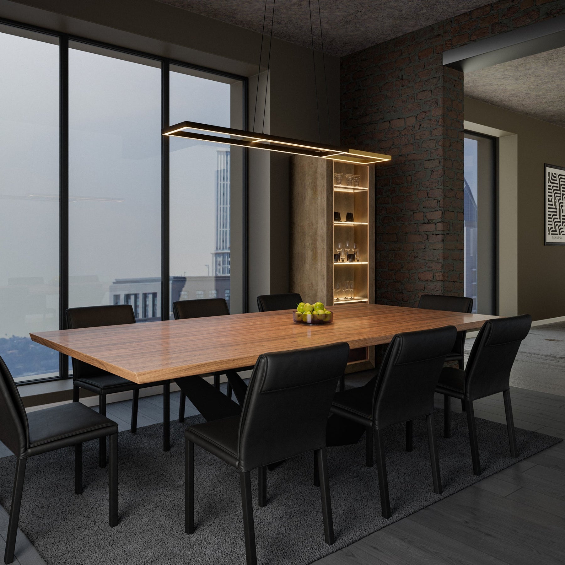 Double Entendre 42in LED Linear Pendant 3500K in Black Aged Brass. Double vision. The slim, dual-toned design of the airy rectangular framework floats effortlessly in mid-air while providing twice the amount of warm, LED down light. Featuring aluminum body construction with silicon diffusers Ultra-sleek electrified cable eliminates the need for clunky power wires. Height is simple to adjust through push pin connectors on the canopy. Sloped ceiling compatible. Universal Input Voltage Driver (120V-240V-277V) concealed in the canopy. Smooth and continuous dimming with an electronic low voltage (ELV) or TRIAC dimmer. High Powered Replaceable LED Module CRI: 90, Rated Hours: 50,000, Selectable Color Temp: 2700K-3000K-3500K-4000K Standards: ETL & cETL UL 1598 listed for Damp Locations.
