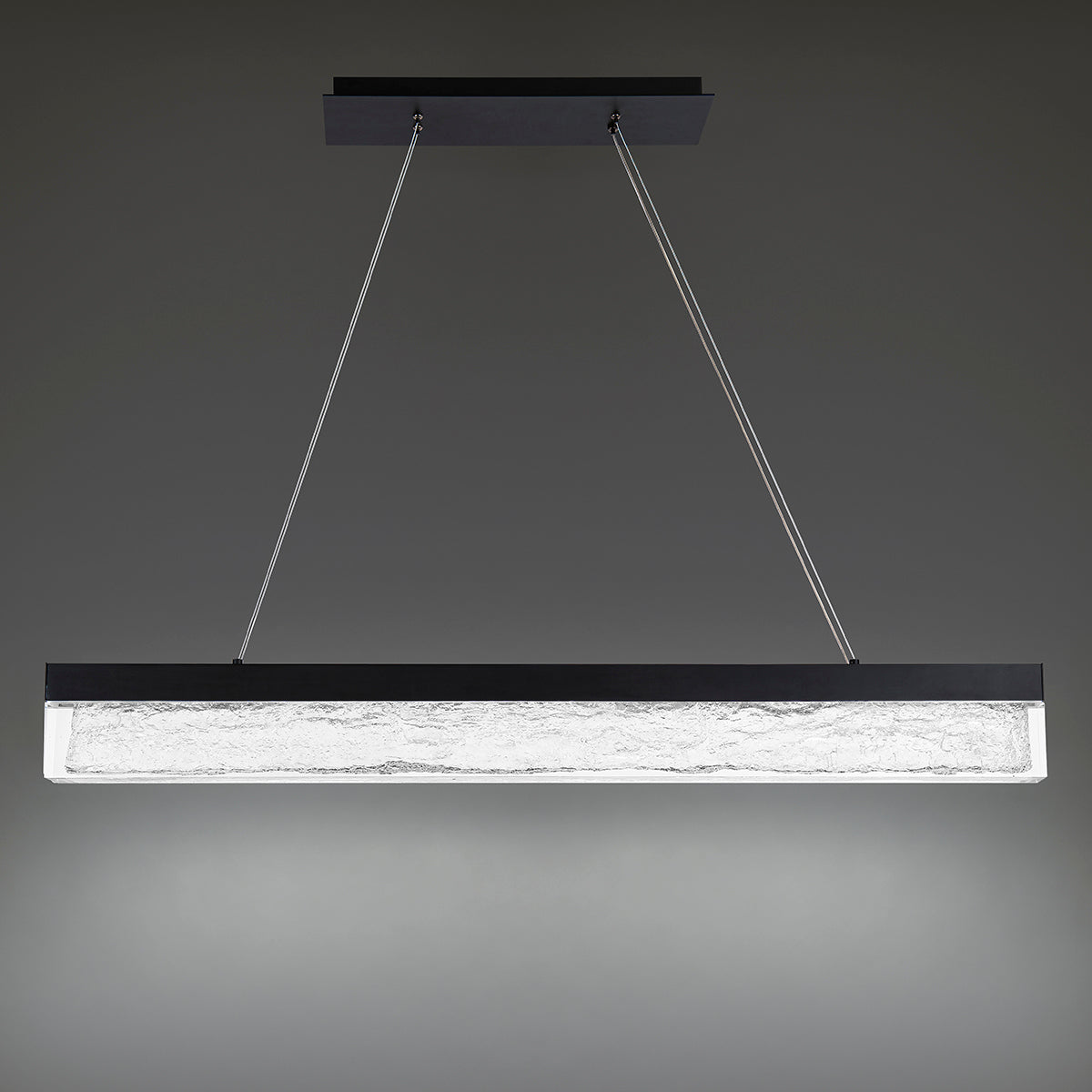Effervescent 45in LED Linear Pendant 3000K in Black. A glamourous facade of illumination, rooted in a minimal elegant aesthetic that is substantial enough to be an iconic piece of architectural lighting with style and proportion. Simply a glittering, breathtaking presentation of light. Effervescent is a 45-inch linear pendant featuring a cutting edge translucent acrylic shade with bark-textured interior patterns that create an impressive reflective quality. Carefully suspended by four electrified aircraft cables, Effervescent eliminates the need for dangling power cords found in traditional LED pendants. The arrangement of energy efficient integrated LED's in its frame passes light through the patterns of the acrylic for an effective downlight and ambient light delivery. Available in black or brushed aluminum finishes. The Effervescent linear pendant is a glittering, breathtaking presentation of light. Energy efficient integrated LED's are concealed behind a substantial acrylic diffuser with tree-bark texture creating a bright and even illumination. Ultra-sleek electrified cable eliminates the need for clunky power wires. Height is simple to adjust through push pin connectors on the canopy. Universal Input Voltage Driver (120V-240V-277V). Custom CCT options available by special order. Smooth and continuous dimming with an electronic low voltage (ELV) dimmer. High Powered Replaceable LED Module CRI: 90, Rated Hours: 50,000, Color Temp: 3000K Standards: ETL & cETL UL 1598 listed for Damp Locations. CEC Title 24 Compliant.