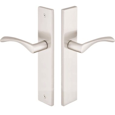 Solid Brass Euro Style Dummy Pair Multi Point Lock Trim (Brushed Nickel Finish) - The alluring Emtek piece of patio door hardware shown here features a beautiful brushed nickel finish. Measures 2 inches wide by 10 inches tall. Sold as a complete set, which includes plates, handles and cylinder. Multi point mortise lock box is not included. Trims only.