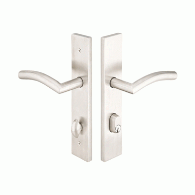 Stainless Steel Keyed Style Multi Point Lock Trim (Brushed Stainless Steel Finish) - The Emtek swinging patio door hardware displayed here includes a smooth brushed stainless steel coating. Measures 2 inches wide by 10 inches tall with a 3 5/8 inch center to center hole spacing. Sold as a complete set, which includes plates, handles and cylinder. Multi point mortise lock box is not included. Trims only.