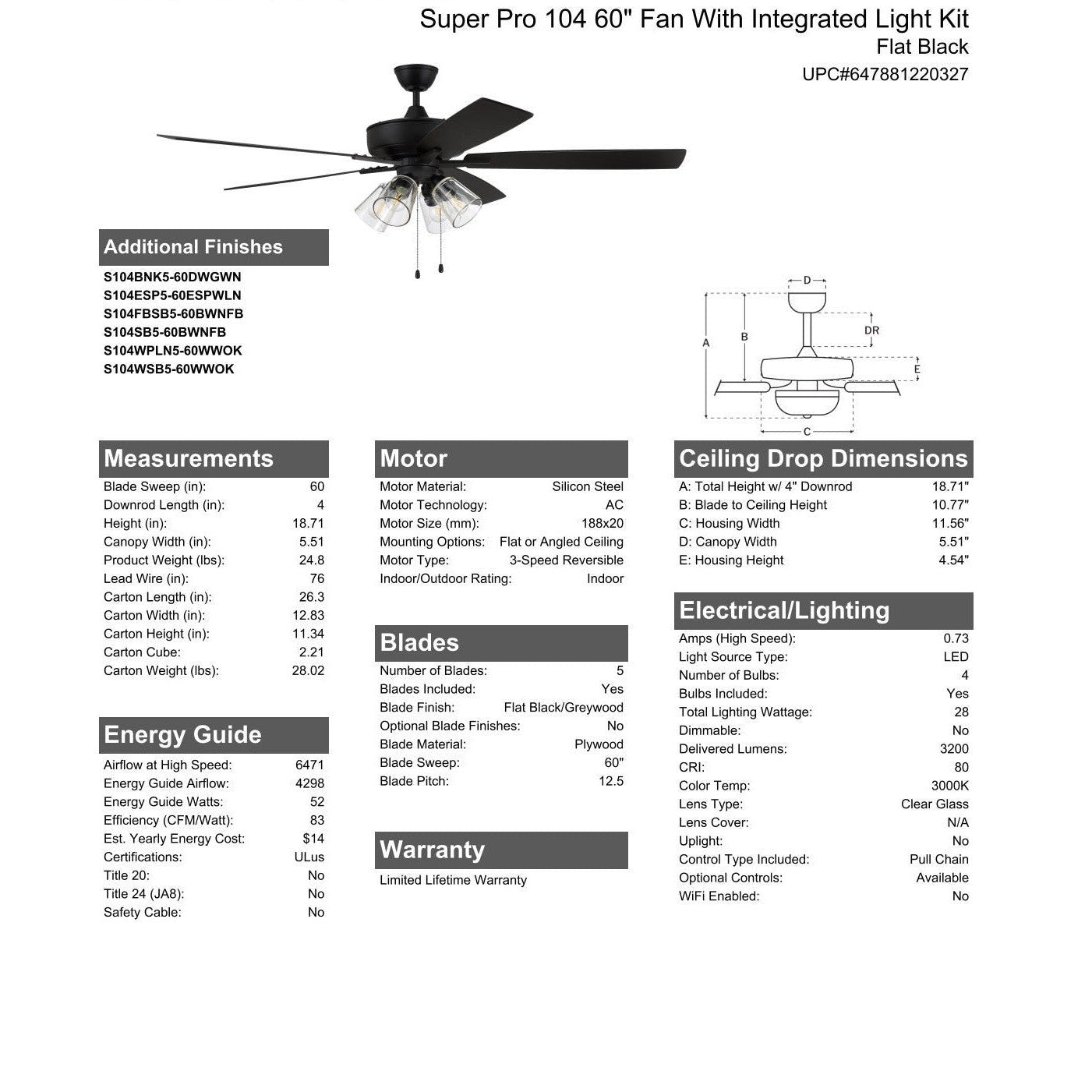 The ideal combination of excellent performance, exceptional value and timeless style, the Craftmade Super Pro 60" ceiling fan with clear glass four light (non-dimmable LED bulbs included) light kit featuring a clean motor, updated straight blade arms and canopy is built for performance. The dual mount, heavy-duty, 3-speed, reversible fan includes custom 60" reversible blades. Optional remote controls are available(Sold Separately).