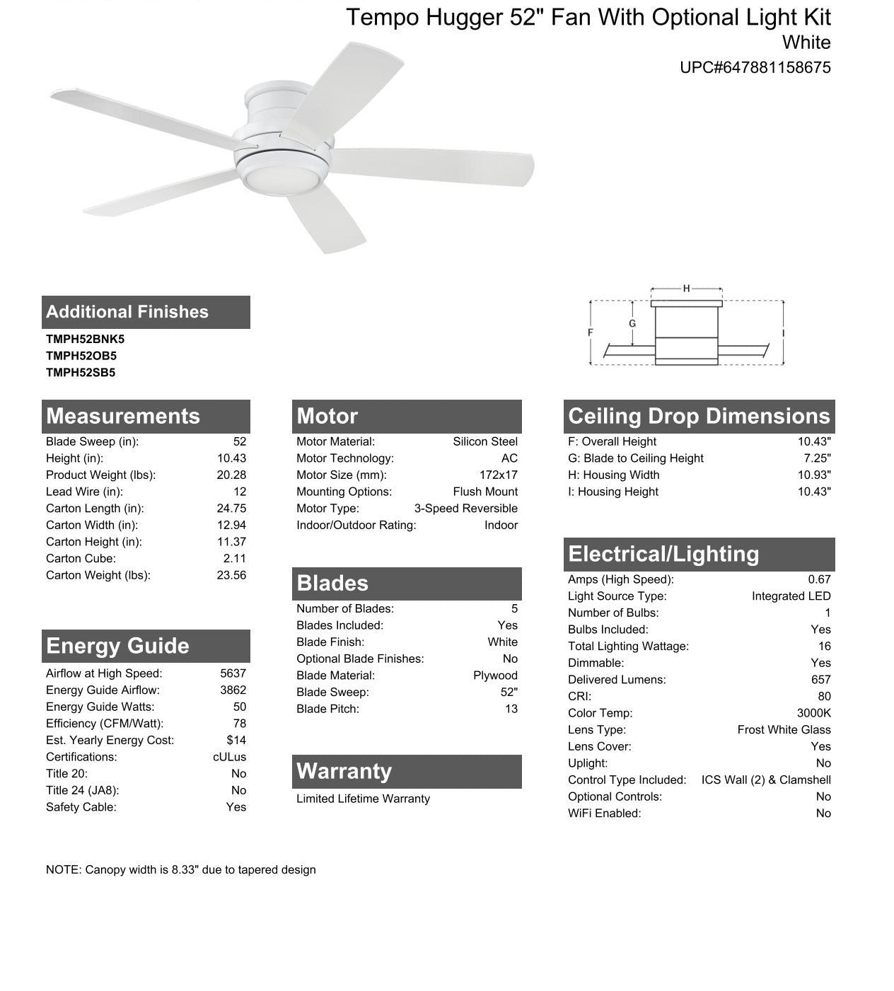 • Custom Reversible Tempo Hugger 52" Blades Included White