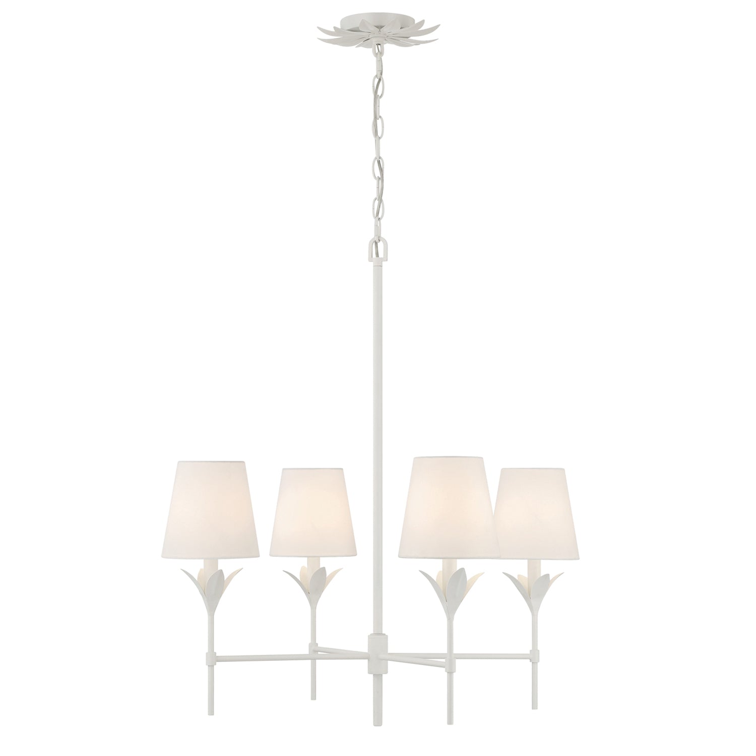 The Broche 4 Light Chandelier embodies a harmonious blend of traditional and modern elements. This fixture exudes timeless elegance with its candelabra-style frame and white linen shades. The layered wrought iron leaves create a stunning and functional display of light. Whether in a bedroom, living area, or kitchen, this chandelier adds a touch of refined glamour to any space, making it perfect for transitional and modern designs.