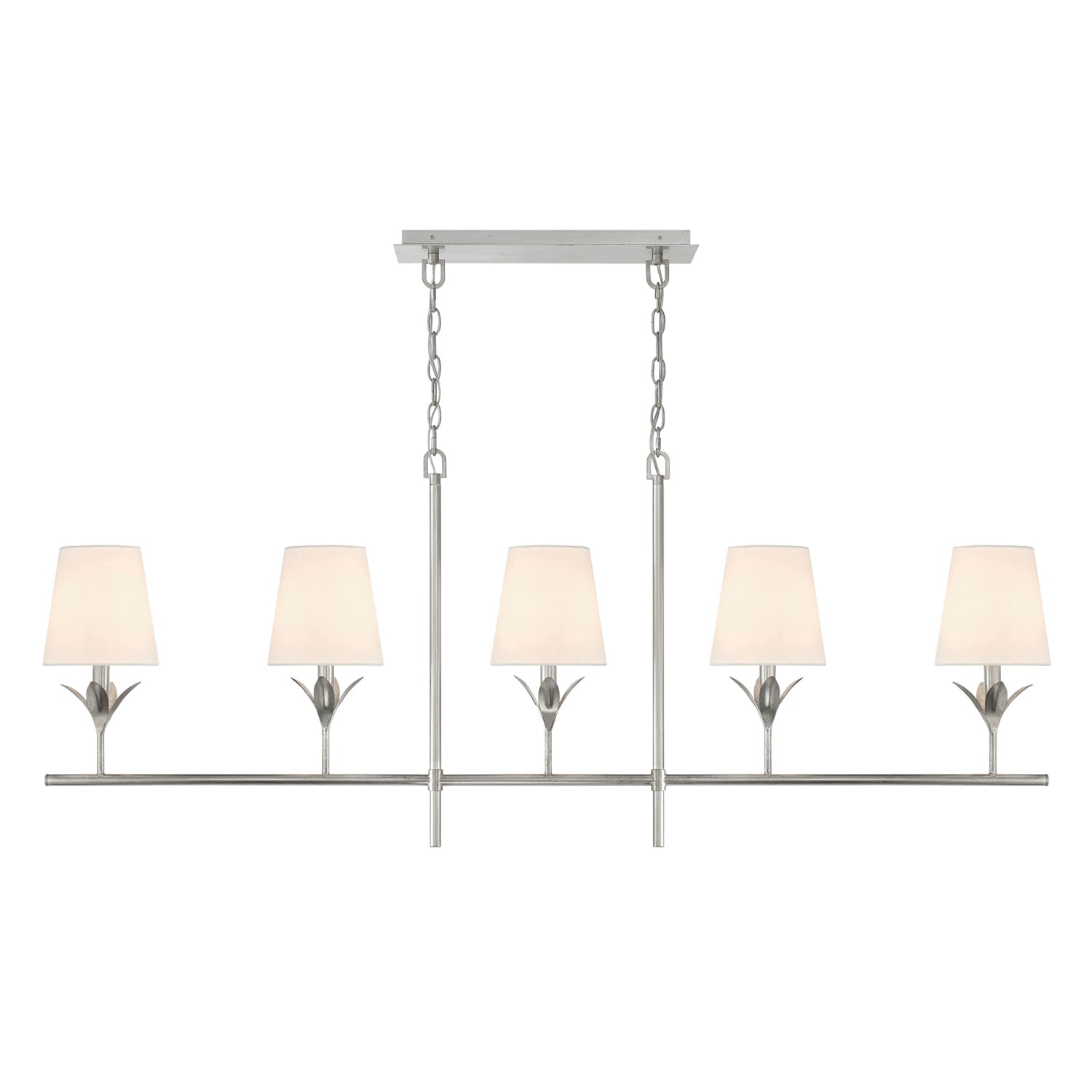 The Broche 5 Light linear Chandelier embodies a harmonious blend of traditional and modern elements. This fixture exudes timeless elegance with its candelabra-style frame and white linen shades. The layered wrought iron leaves create a stunning and functional display of light. Whether in a dining room, or over a kitchen island, this chandelier adds a touch of refined glamour to any space, making it perfect for transitional and modern designs.
