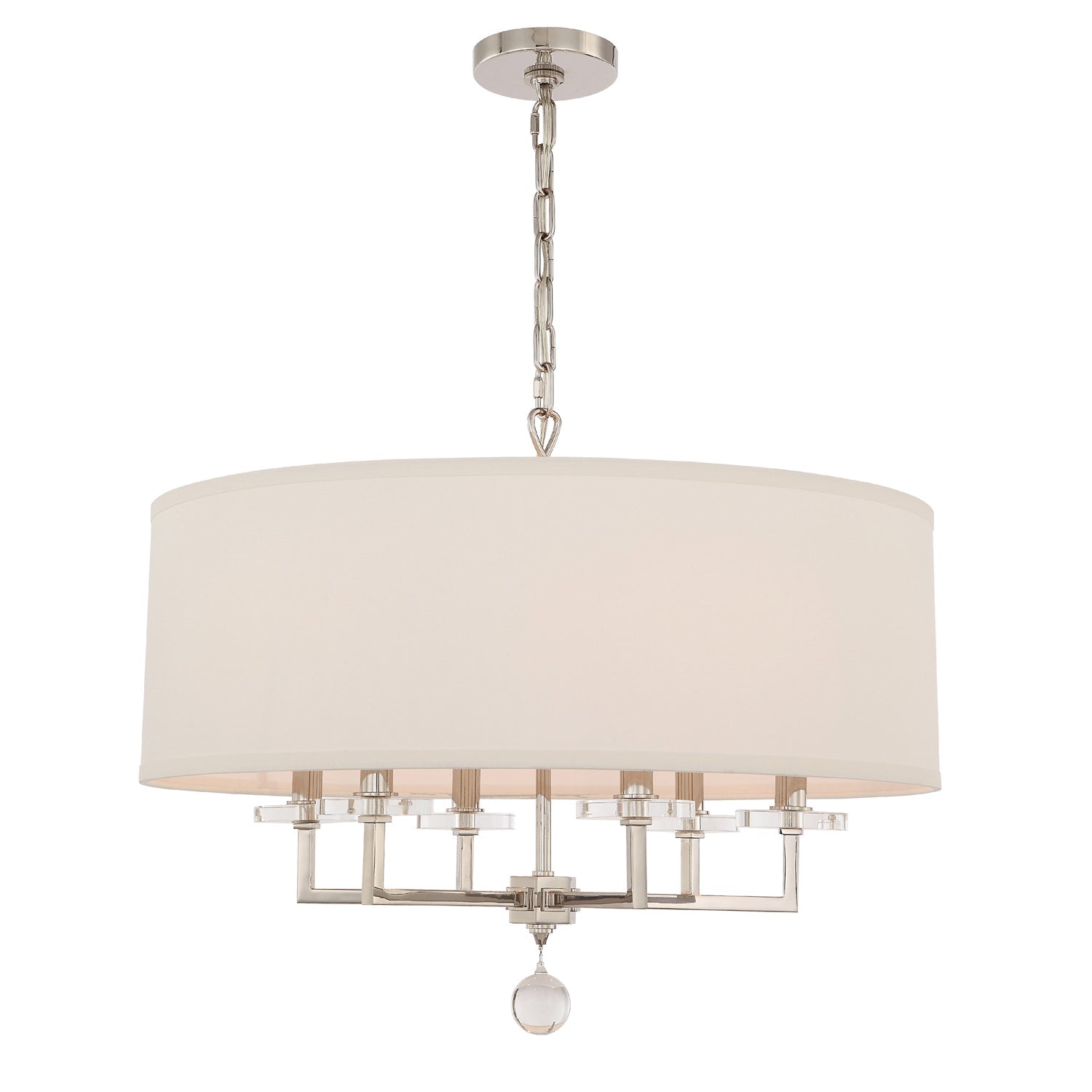The Paxton collection combines geometrically arranged chunky glass bobeches with a frame of super-sleek, tapered crystal column ending with a single hanging glass ball. The delicate lines of the shapely frame, combined with the precisely balanced arms and simple, tailored shade, create a clean, transitional feeling with a distinct, mid-century modern flair. Stylish, modern and minimal, Paxton brings luxurious appeal to a variety of interior spaces.