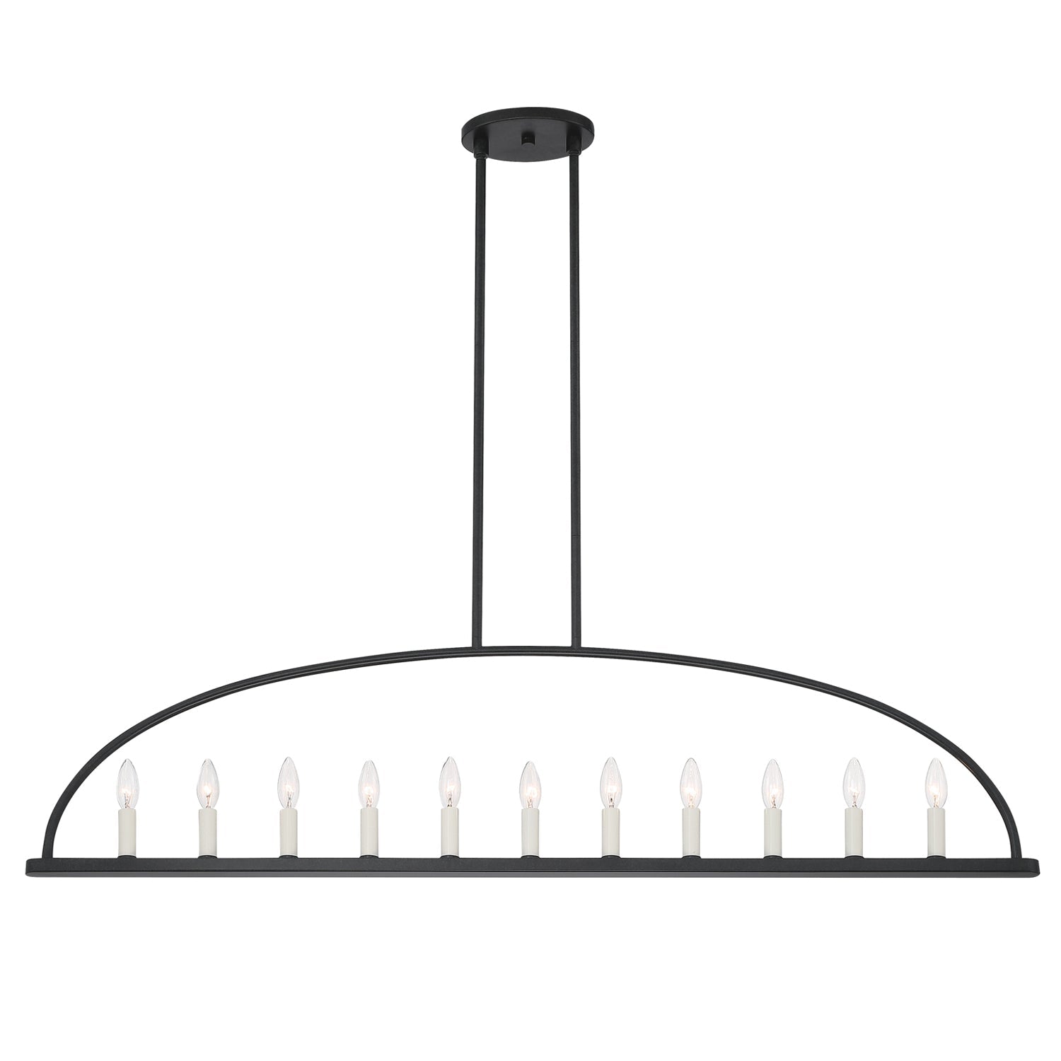 The Abbott linear chandelier presents a simple, streamlined shape and clean lines. The open-concept frame features a metal arch and a sleek, narrow rod with a series of thin bulbs. Mounted above an island or over a dining room table, this fixture appeals to a minimalist sense of style and comes with both white and gold candle sleeves. The Abbott comes in vibrant gold and black finish.