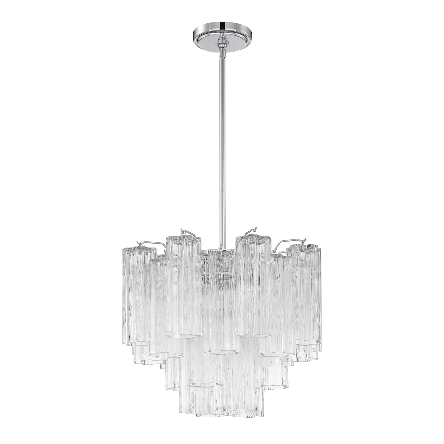 The captivating Addis Lighting Collection is a modern-day interpretation of the iconic mid-century Tronchi chandelier. Inspired by its predecessor's sleek lines and geometric shapes, the Addis features a polished Chrome or Aged Brass metal frame that exudes sophistication and style. Its unique design showcases transparent tiers of textured Tronchi glass tubes, forming a mesmerizing 5-point rounded star shape. Choose from a range of glass colors, including clear, amber, smoke, and white, or the stunning Autumn option, which features a captivating multicolor disposition of amber, clear, and smoke Tronchi glass. The Addis Lighting Collection offers various sizes and finishes, allowing you to find the perfect fit for your space while adding a touch of timeless elegance.