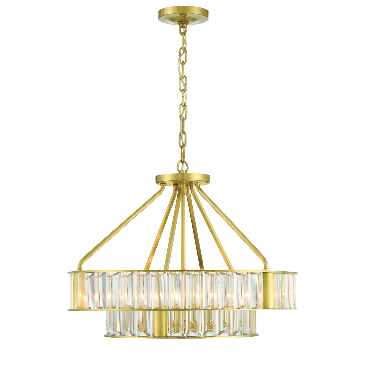 The Libby Langdon Farris chandelier is a study of simple elegance. The two-tier frame is made up of thick solid glass rods and a sleek and lean circular metal frame in a brushed, Vibrant Gold brass finish. The upper metal rods that connect both tiers to the canopy are round and have a slight eased bend as they meet the round frame to add a little softness. The Farris chandelier is as beautiful to look at from the bottom as it is to see it from the side; the scale and size of the piece feel luxurious and substantial without feeling clunky or too heavy.