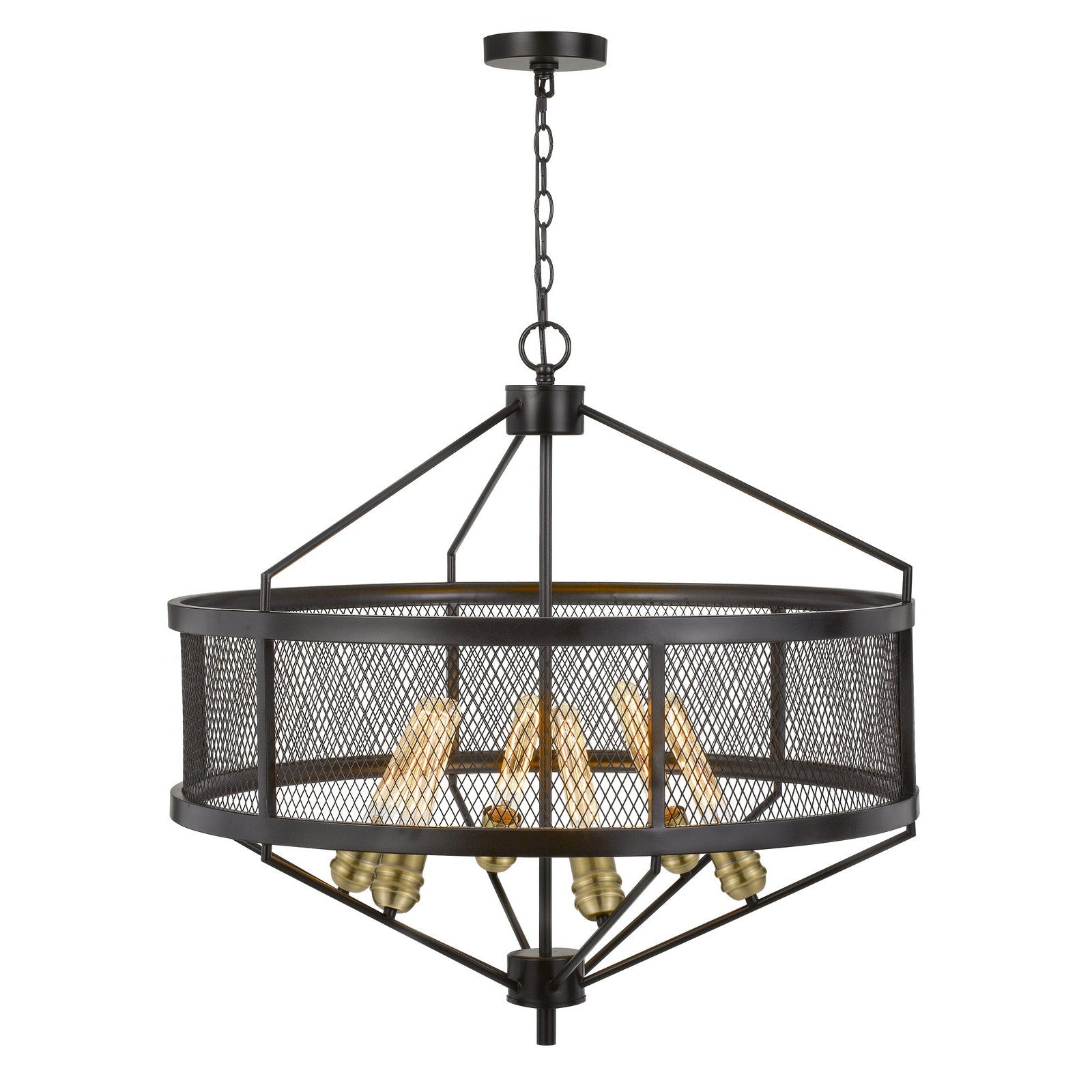 The FX-3743-6 Halle Metal Chandelier is a stunning lighting fixture that combines antique brass and black finishes for a sophisticated touch. Designed to accommodate six E26 base bulbs (not included), it supports a maximum wattage of 60W per bulb. The chandelier features a unique drum mesh metal shade that adds character while allowing for optimal light distribution. With package dimensions of 32.50 inches in length, 32.50 inches in width, and 19.30 inches in height, this chandelier is perfect for grand spaces, creating a warm and inviting atmosphere. Assembly is required, and it comes with a one-year warranty against defects in material and workmanship.