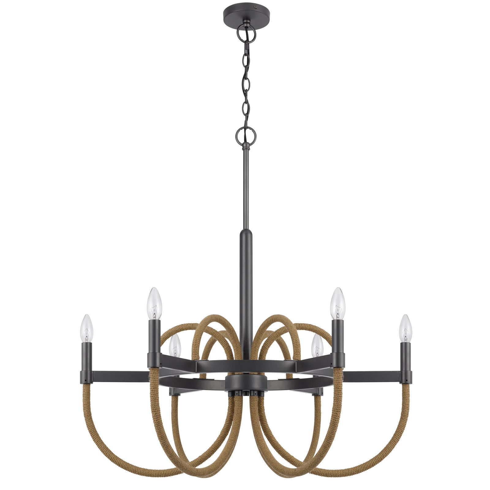 The Rowland 60W x 6 Metal/Burlap Roped Chandelier combines contemporary design with classic candelabra style, making it an ideal centerpiece for any room. This hardwired fixture includes six lights with E12 bulb bases, supporting a maximum wattage of 60W per bulb. Crafted from durable metal with braided burlap accents, it is both chic and sturdy. The chandelier features a 72-inch dark bronze chain for hanging and ships in one carton, complete with a canopy. Minor assembly is required, and it comes with a one-year warranty, ensuring peace of mind for your lighting choice.