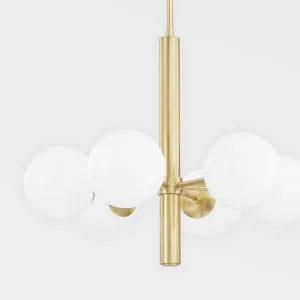 The Stella chandelier by Mitzi is a stunning centerpiece that combines elegance and functionality. With a width/diameter of 28.00 inches and a height of 23.75 inches, it features an opal glossy glass shade that softens the light beautifully. This chandelier can accommodate six E26 medium base bulbs (not included), with a maximum wattage of 60W per bulb, making it ideal for brightening larger spaces. Designed with a UL Damp rating, it is suitable for areas subject to moisture. Choose from two exquisite finish options: Aged Brass (AGB) and Old Bronze (OB) to complement your decor.