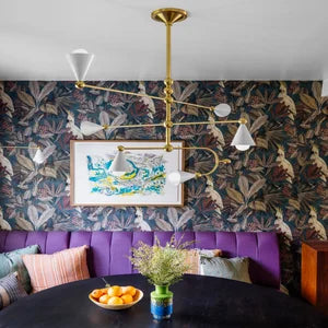 The Hikari chandelier by Mitzi features a striking design with a width of 42.50 inches and a height of 22.75 inches, making it a stunning focal point for any space. This elegant fixture boasts a steel shade in an aged brass and soft white finish (AGB/SWH) that complements its sophisticated aesthetic. It accommodates six E12 candelabra base bulbs (not included), with a maximum wattage of 60W each, allowing for ample illumination. Rated UL Damp, this chandelier is suitable for use in areas with higher humidity, providing versatility in both style and function.