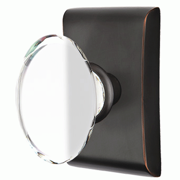 Crystal Hampton Door Knob Set With Neos Rosette - Made for modern doors - versatile, elegant, adaptable - this Crystal Oval Hampton style door knob set measures 2 3/4 inches overall with a 3 1/4 inch projection. This knob set with fit any door thickness between a standard 1 3/8 inch to a 2 1/4 inch thick. This door knob set is available in several finishes and functions. Passage (Hall/Closet) and Privacy (Bed/Bath) sets come complete with the functioning hardware and a 2 3/8 inch back-set is standard. A 2 3/4 inch back-set is also available upon request. This particular product has a lead time of approximately 3 to 5 business days.