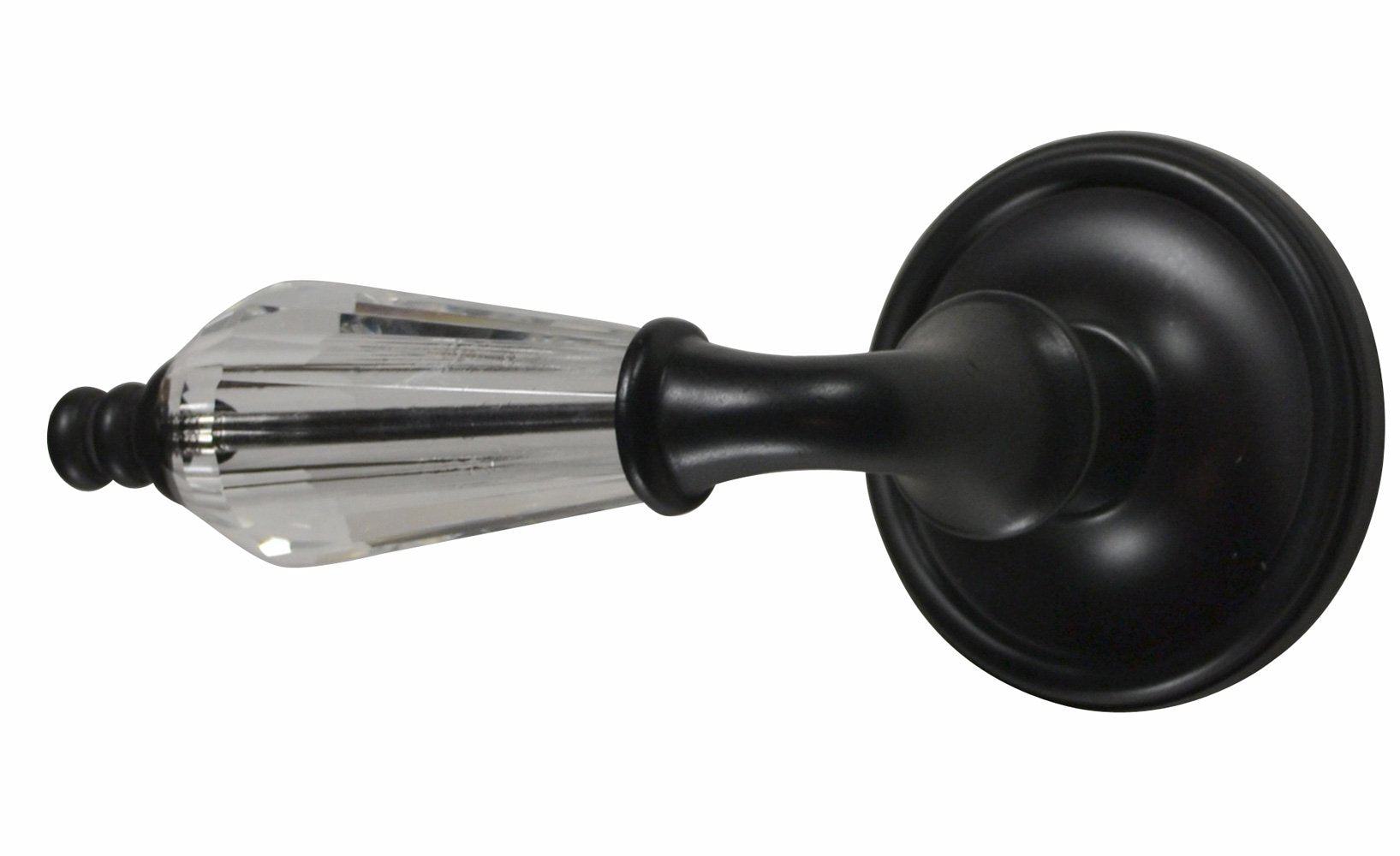 Made for modern doors - the crystal clear glass lever matched with a classic Victorian rosette looks delicate but has a solid brass construction. The lever door knob will grace doors with an enduring quality and operation. The 4 1/2 inch long crystal door lever crafted with interconnecting 2 1/2 inch (63 mm) rosettes has a distinctive period piece attraction. It is designed to fit modern doors with a 2 1/8 inch bore hole. The door knob is available in polished brass, antique brass, polished chrome, Satin Nickel and Black Bronze. The dummy door knob is a fixed knob with double rosettes and is commonly used on French-style or bi-fold doors.