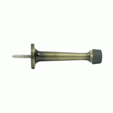3 1/4 Inch Solid Brass Baseboard Door Bumper (Antique Brass Finish) - measures 3 1/4 inches long and comes with 2 rubber tips. This style of door stop provides protection for the door by preventing it from banging against a wall causing damage to drywall or plaster and paint. This door stop is available in many designer finishes and comes complete with the mounting hardware.