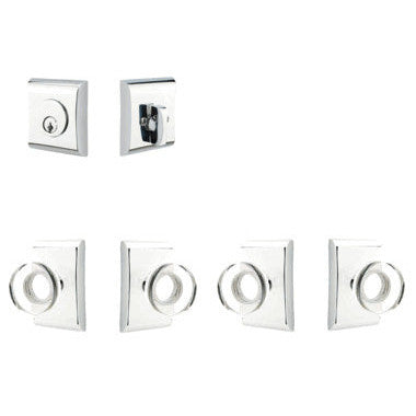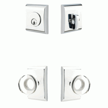 Emtek Single Door Entryway Modern Disc Crystal Knob With Neos Rosette - this entryway set measures 2 1/2 inches wide. The deadbolt plate measures 2 3/4 inches tall, and the door plate measures 4 5/8 inches tall. Various styles of knobs available at no additional charge. Entryway backset comes as 2 3/8 inch standard and a 2 3/4 inch backset is available if required. The overall grip thickness is 1 1/16 inch. The clearance between the door and grip is 1- 1 3/8 inches. The plates have a thickness of 7/16 inch. This is a complete set and it comes with tubular latch mechanisms, strike plates, complete knob sets, internal mechanisms, deadbolts and all mounting hardware.