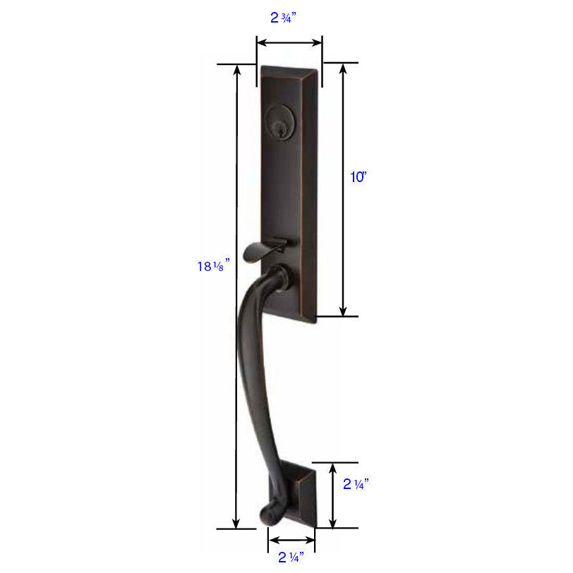 Solid Brass Adams Style Entryway Set (Oil Rubbed Bronze Finish) - this entryway set measures 2 3/4 inch wide by 18 1/8 inch tall. Various styles of knobs available at no additional charge. Entryway set deadbolt to knob center-to-center distance is 5 1/2 inches. Entryway backset comes as 2 3/8 inch standard and a 2 3/4 inch backset is available if required.