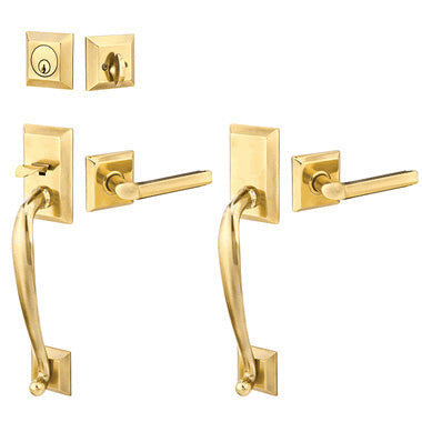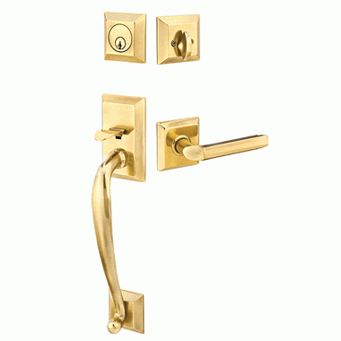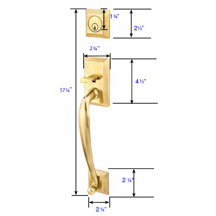 Solid Brass Franklin Style Entryway Set (Polished Brass Finish) - this entryway set measures 2 3/4 inch wide. The deadbolt plate measures 2 1/2 inches tall, and the door plate measures 4 1/2 inches tall. Various styles of knobs available at no additional charge. Entryway backset comes as 2 3/8 inch standard and a 2 3/4 inch backset is available if required. The overall grip thickness is 1 1/4 inch. The clearance between the door and grip is 2 inches. The plates have a thickness of 1/2 inch. This is a complete set and it comes with tubular latch mechanisms, strike plates, complete knob sets, internal mechanisms, deadbolts and all mounting hardware.